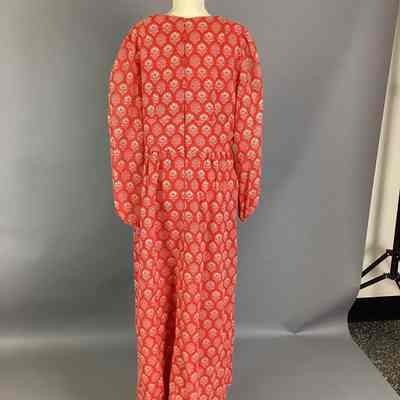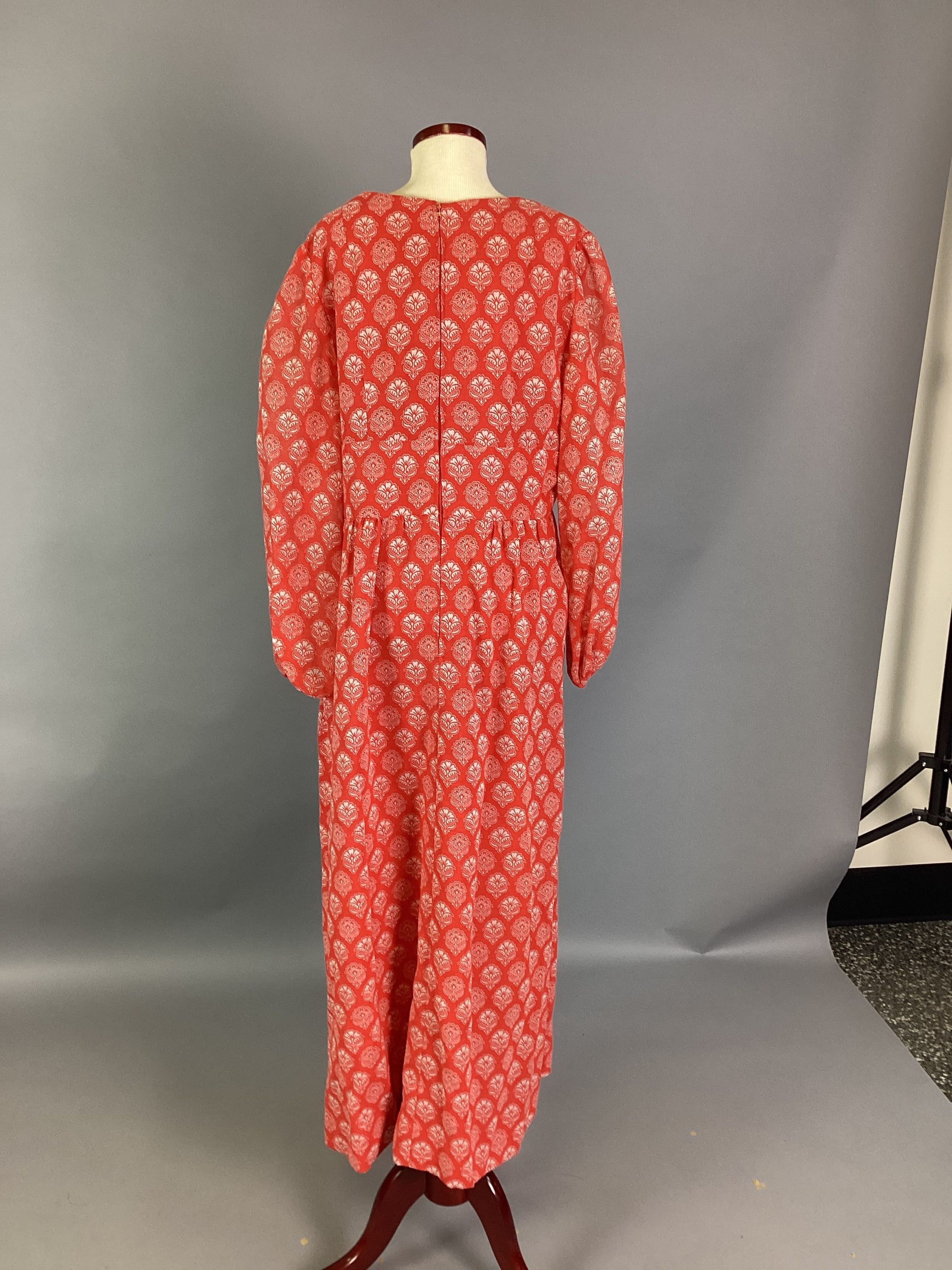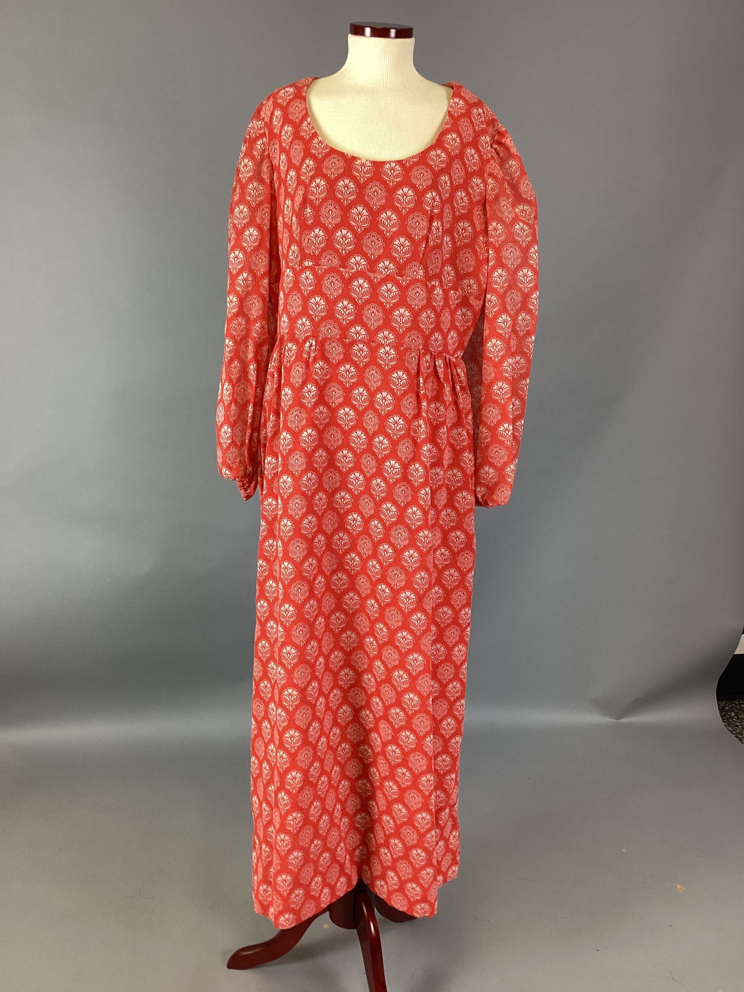 Dress. Red and white print (medallion) with long sleeves, scoop neck, long zipper in the back. Sleeves gathered at wrists, 4" band around empire waist. Completely lined with matching red nylon. 2 1/2" hem at bottom.