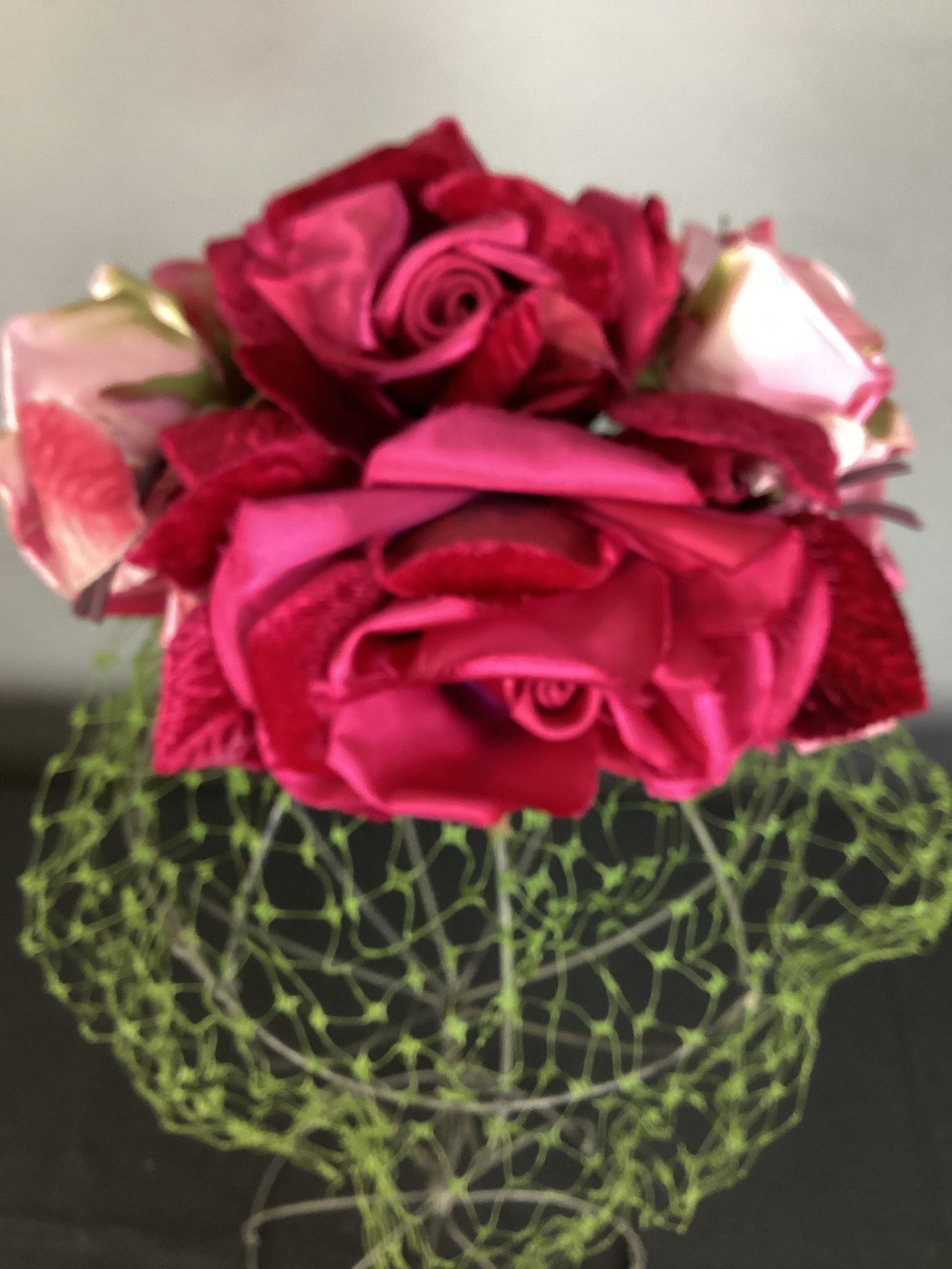 tiny hat green base, covered w/various shades of pink and red roses with moss green veil and side combs to secure to hair from Shillito's Ohio Dept StoreCollection