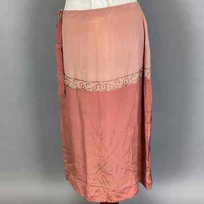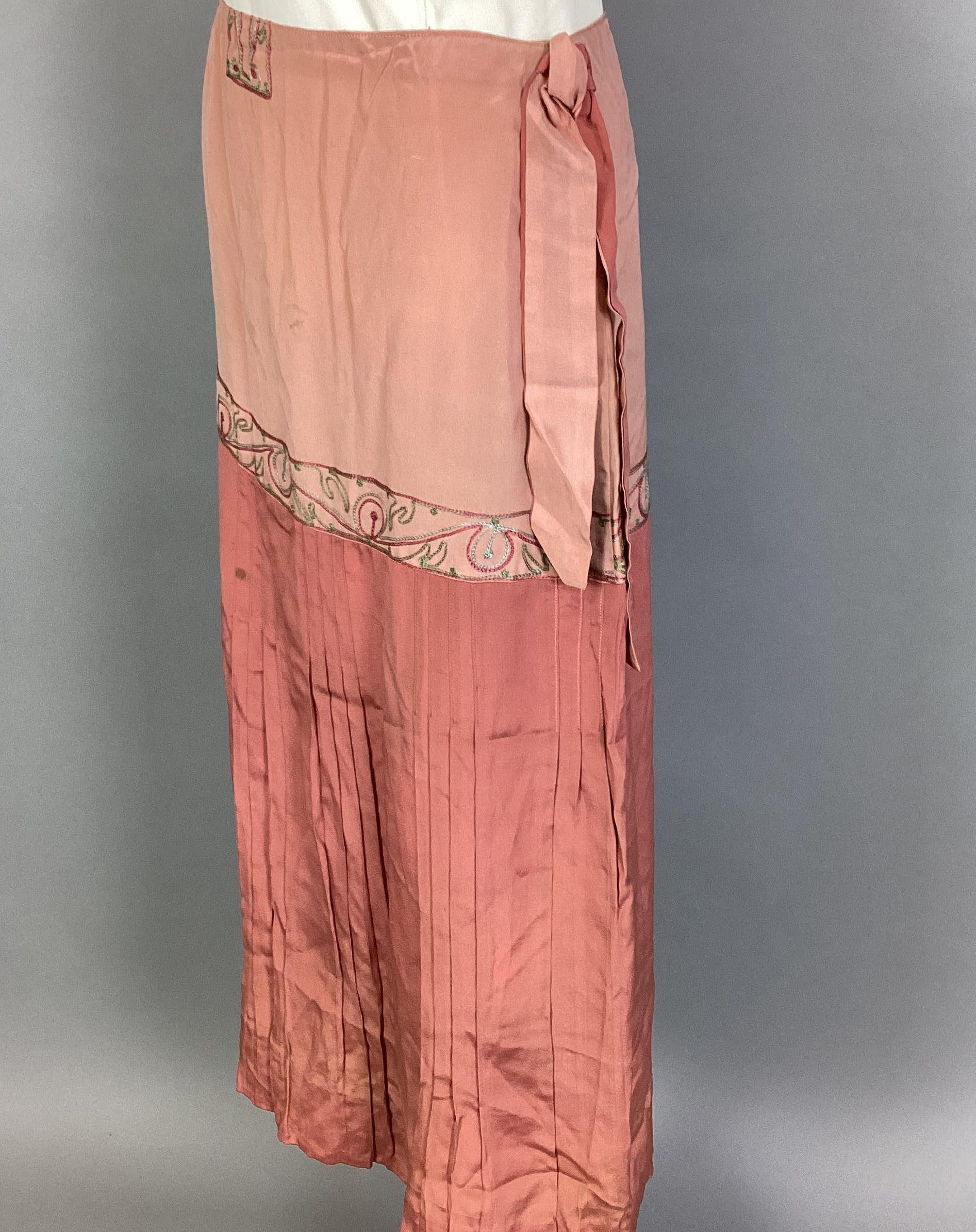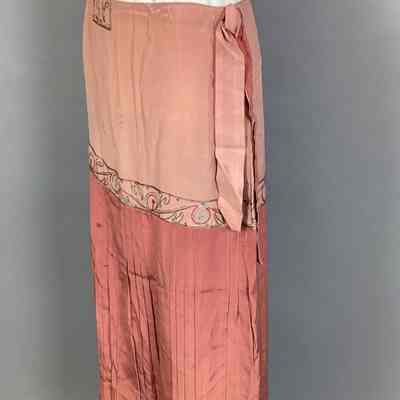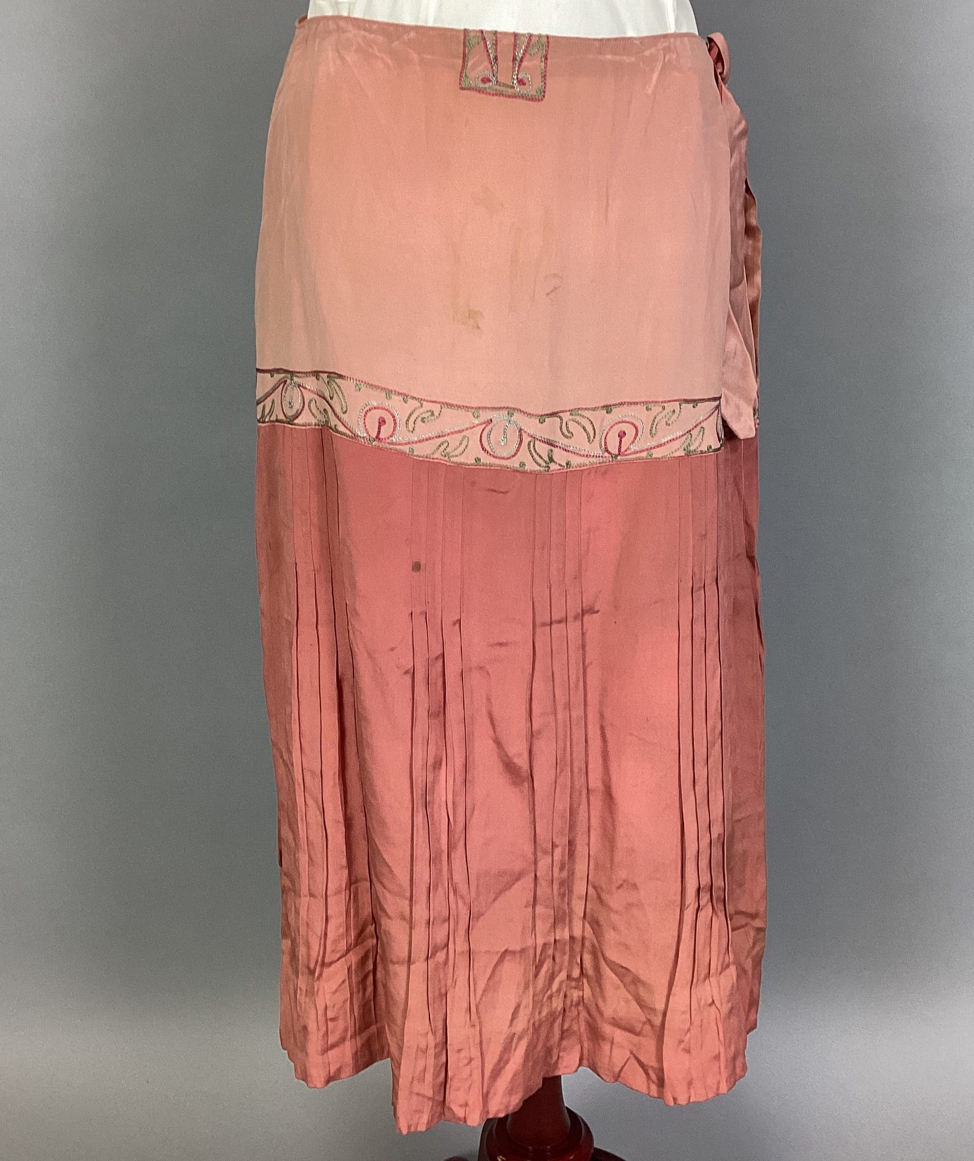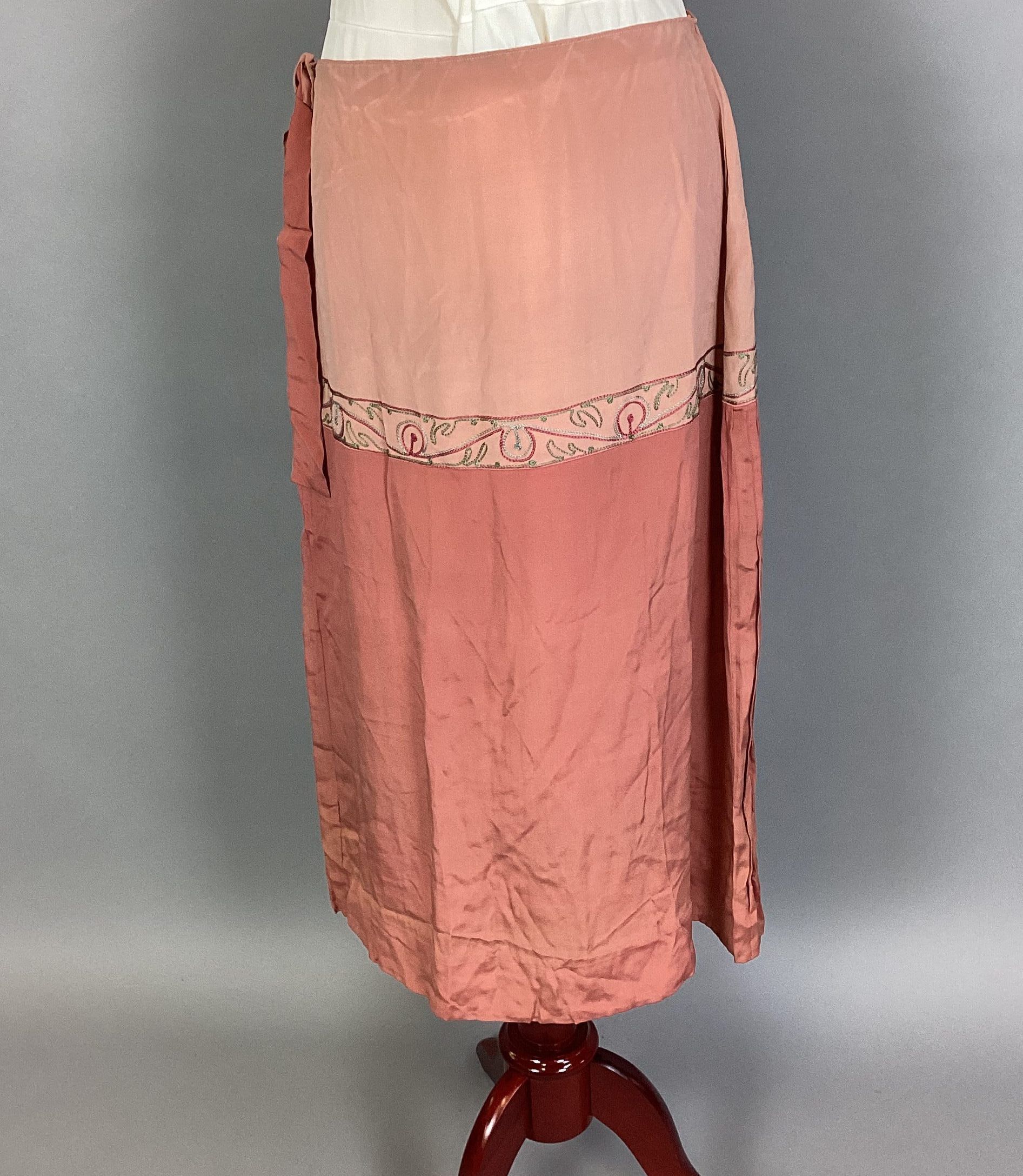 Light and dark salmon colored skirt, rayon material, with pleated skirt, side tie, embrodierery in green and dark salmon.Use