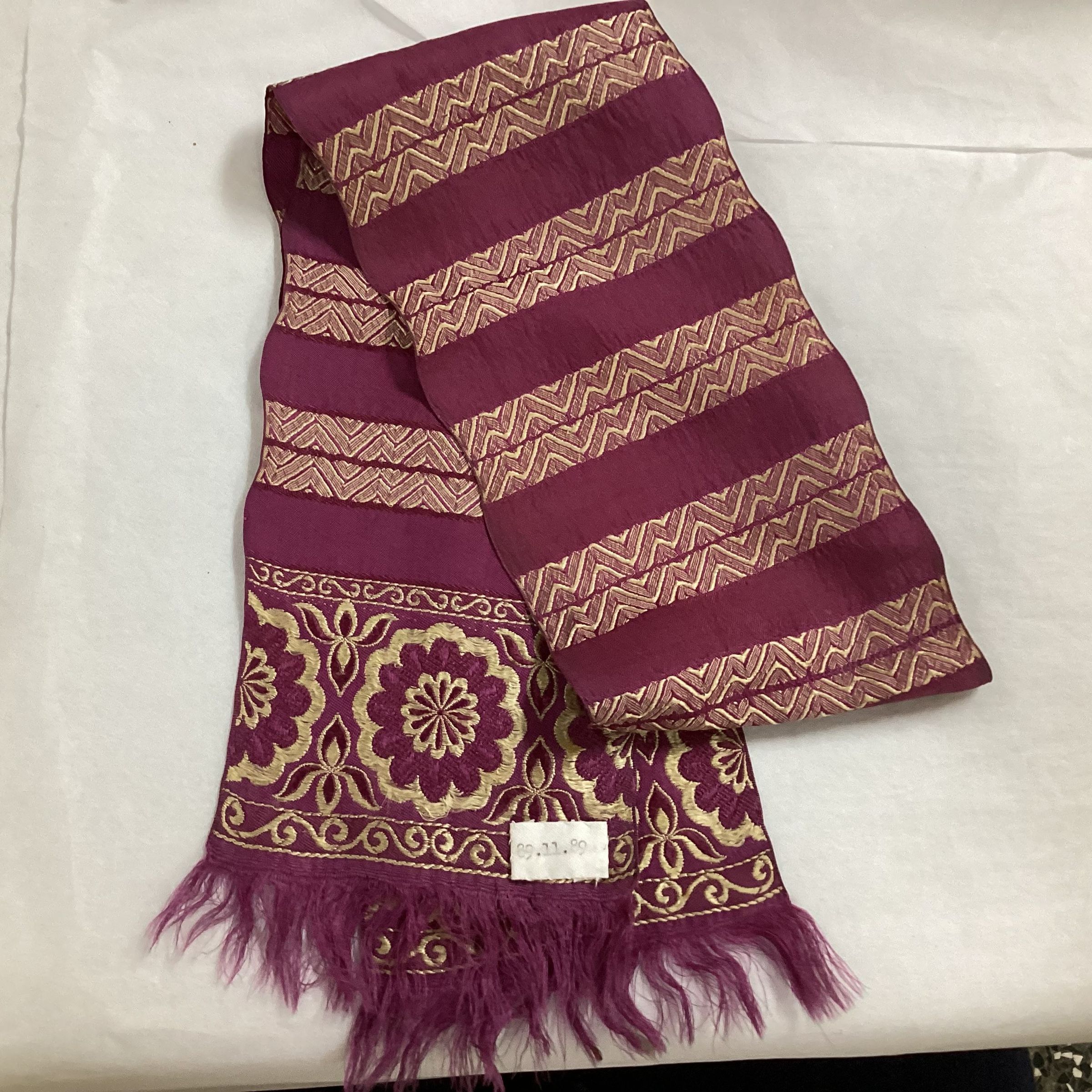 Woman's neck scarf of brocade silk in fuschia and tan color. 4" wide & 34" long with 3/4" fringe. On each end is a 2-1/2" border in circle pattern. 18-3/4" fuschia stripes and 17-5/8" tan and fuschia stripes across length of scarf.