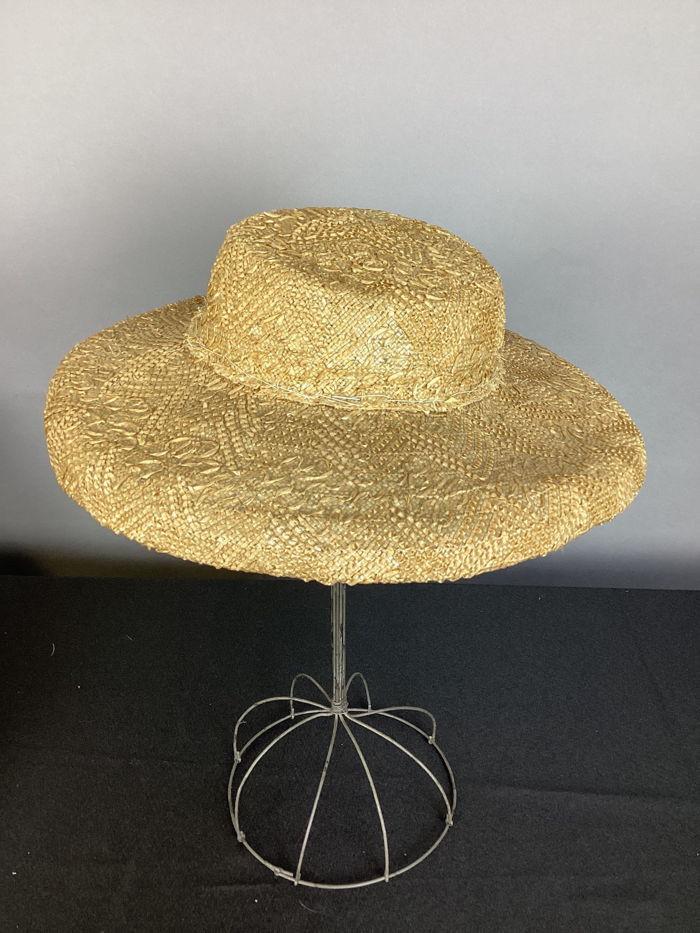 tan straw hat with 3 3/4" rolled brim; has 2" deep crown; untrimmed and in the process of being made.Use