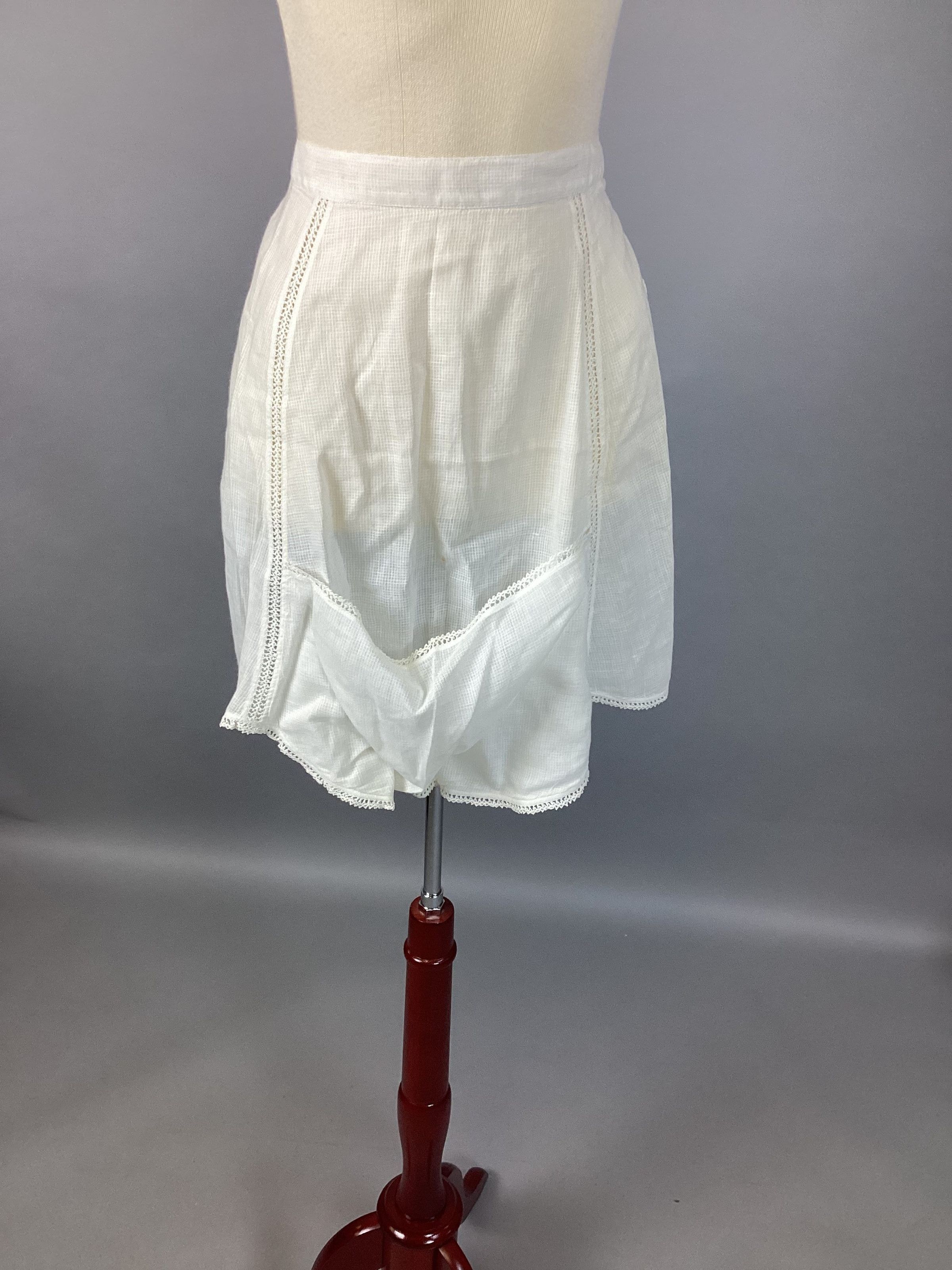 Apron, white batiste, tatting inset & around edges. Large pocket across the bottom, strings tie at waist.Use