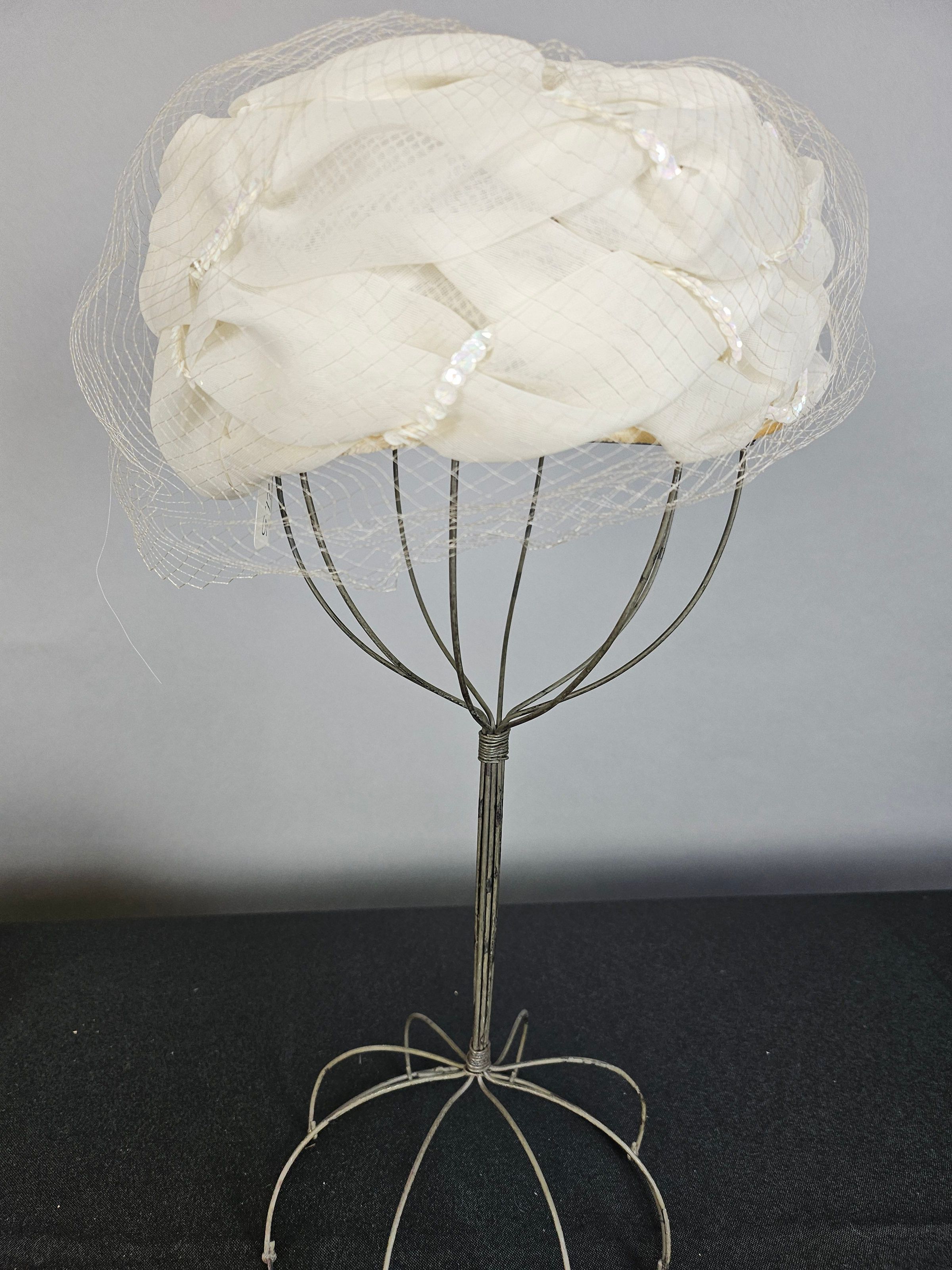 A: White box, 12" x 13" x 7". B: White sheer pill-box hat. Random layered material with sequins interlaced. Veil over front. 13" x 3".Use