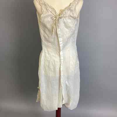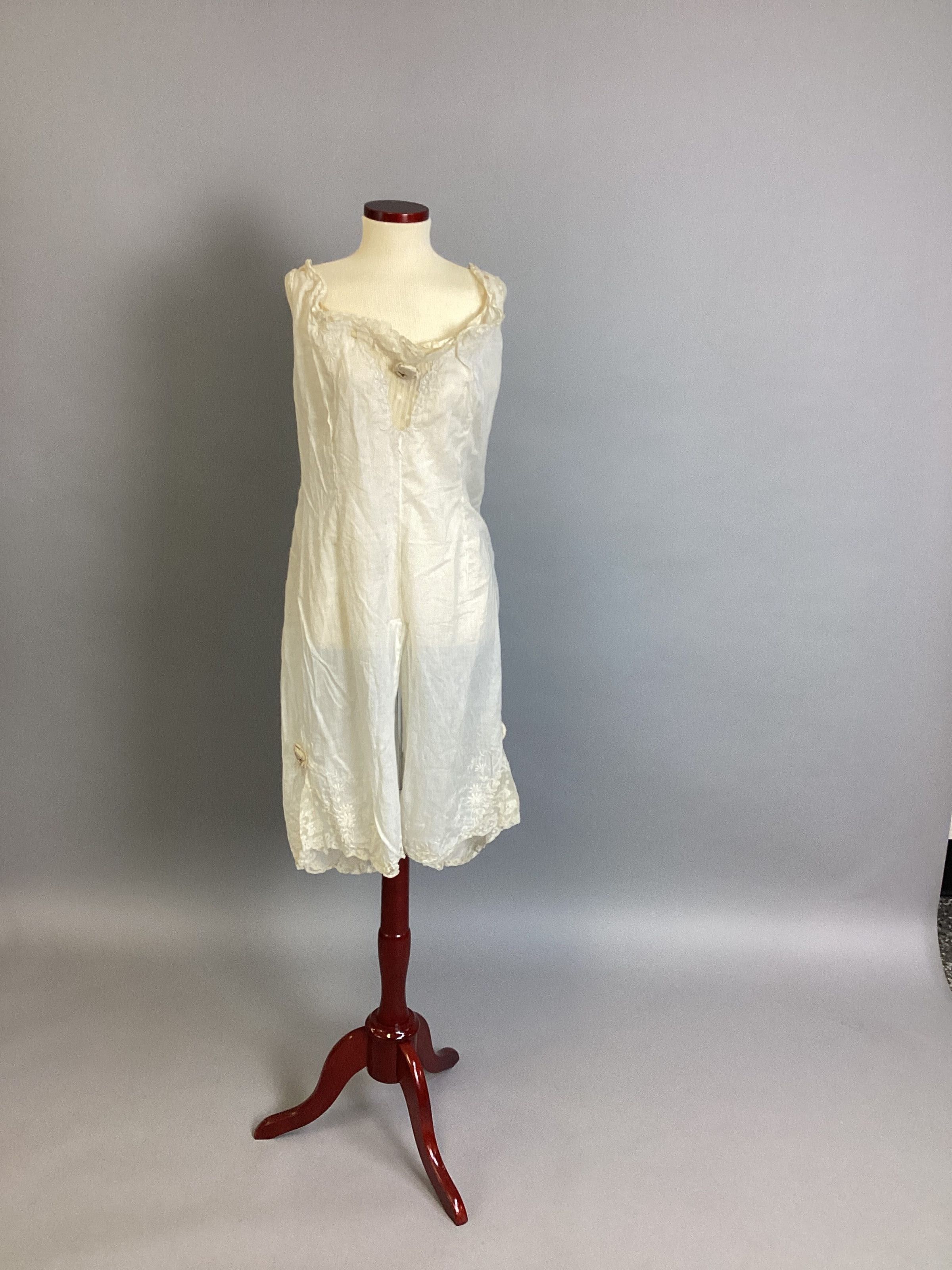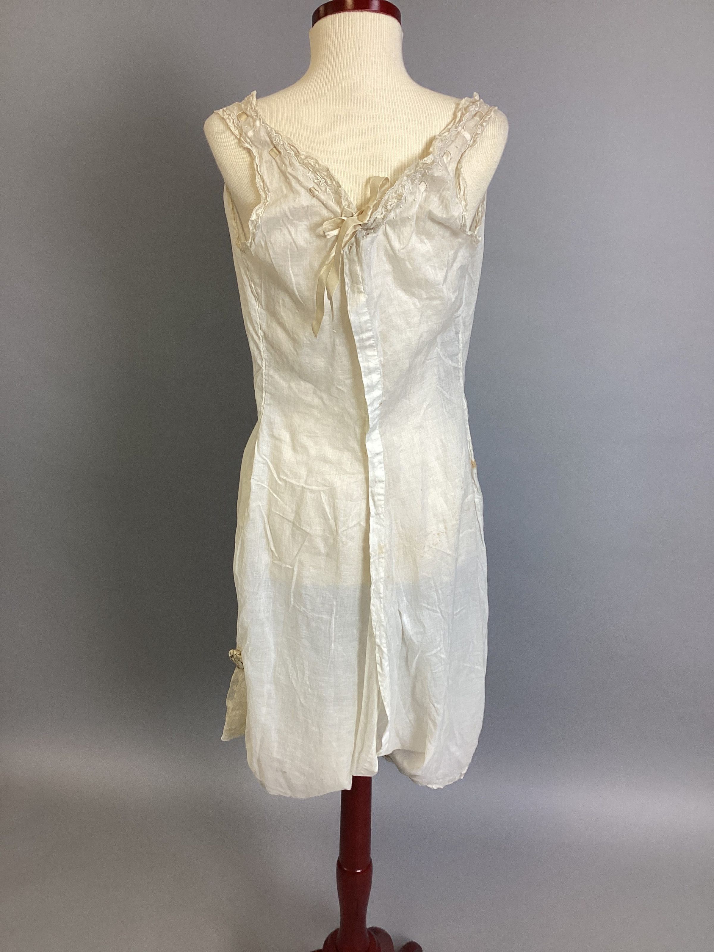 Step-in underwear, soft white cotton w/pink ribbon laced thru neckline, buttons down back with 7 buttonholes. Lace trim at leg w/pink ribbon rosettes, also lace & pink rosettes at neck.Collection