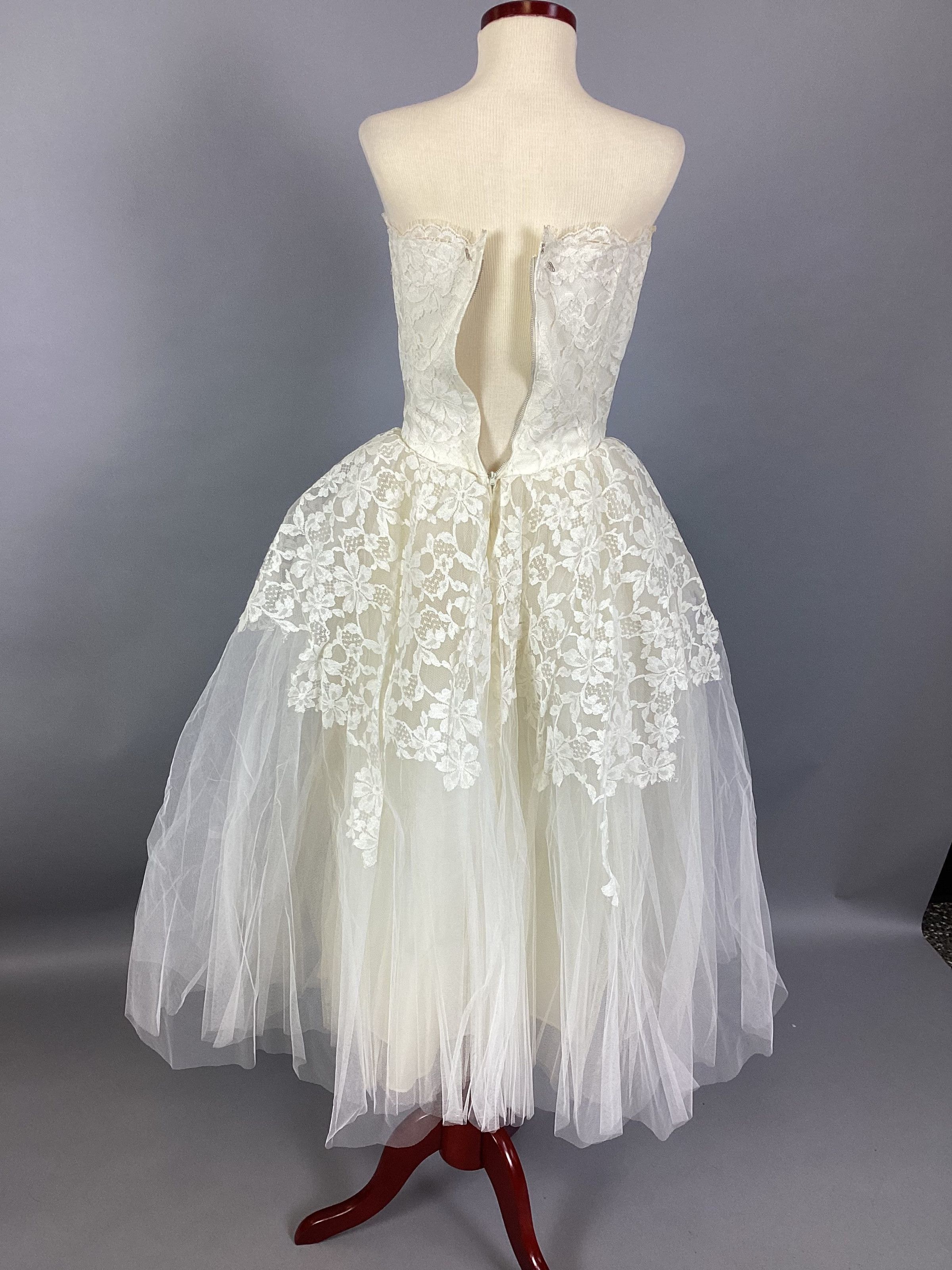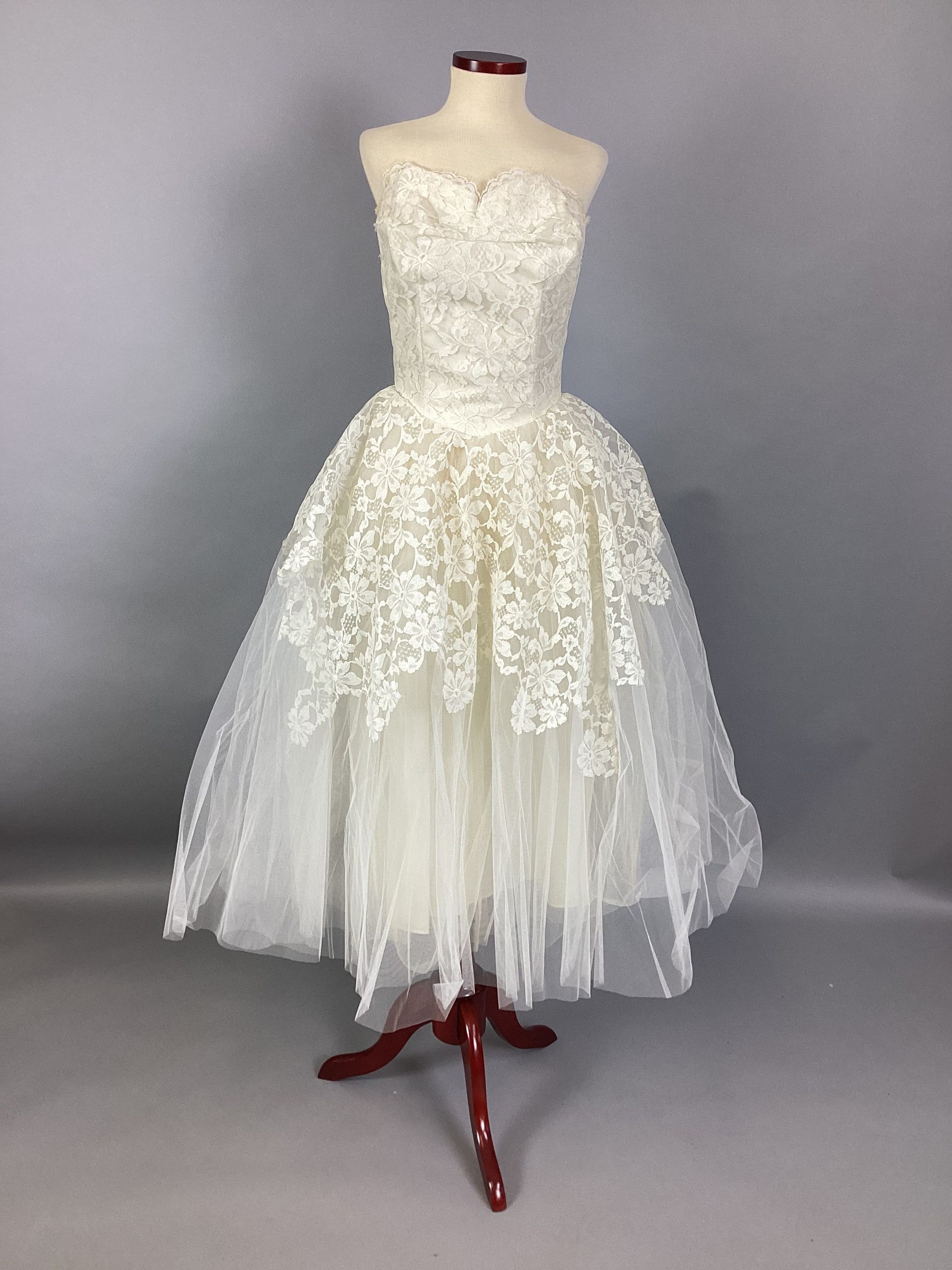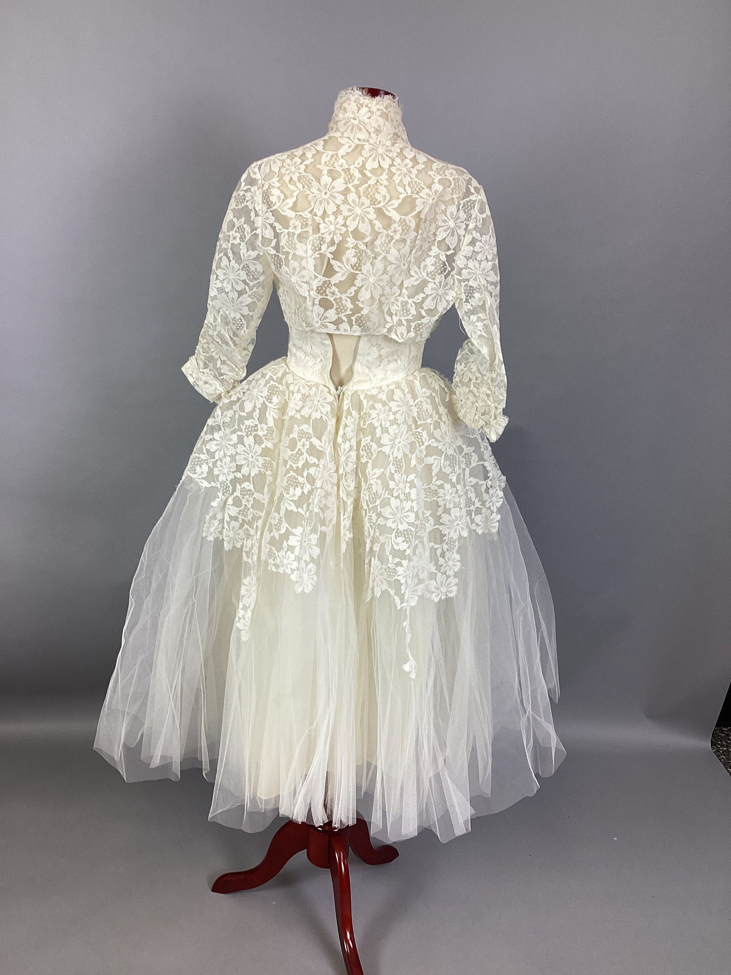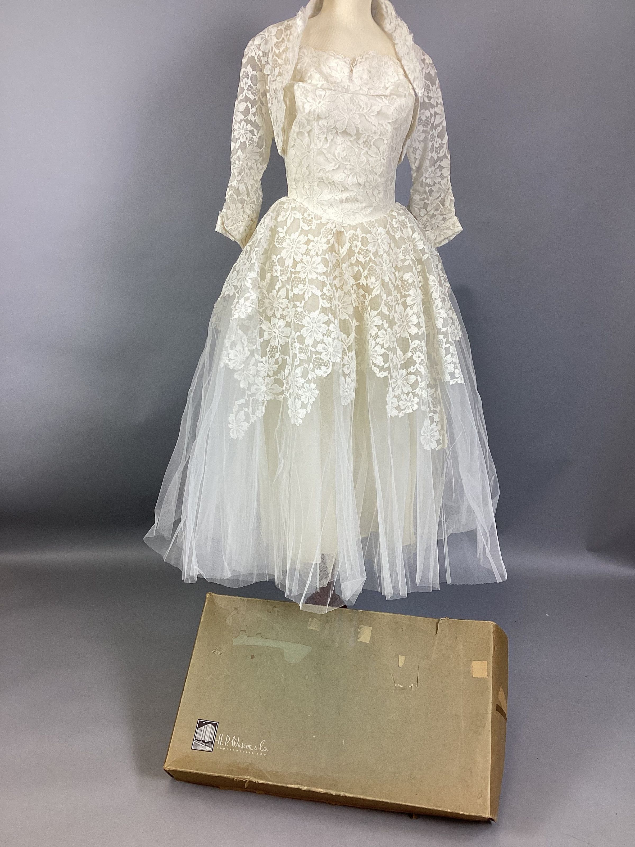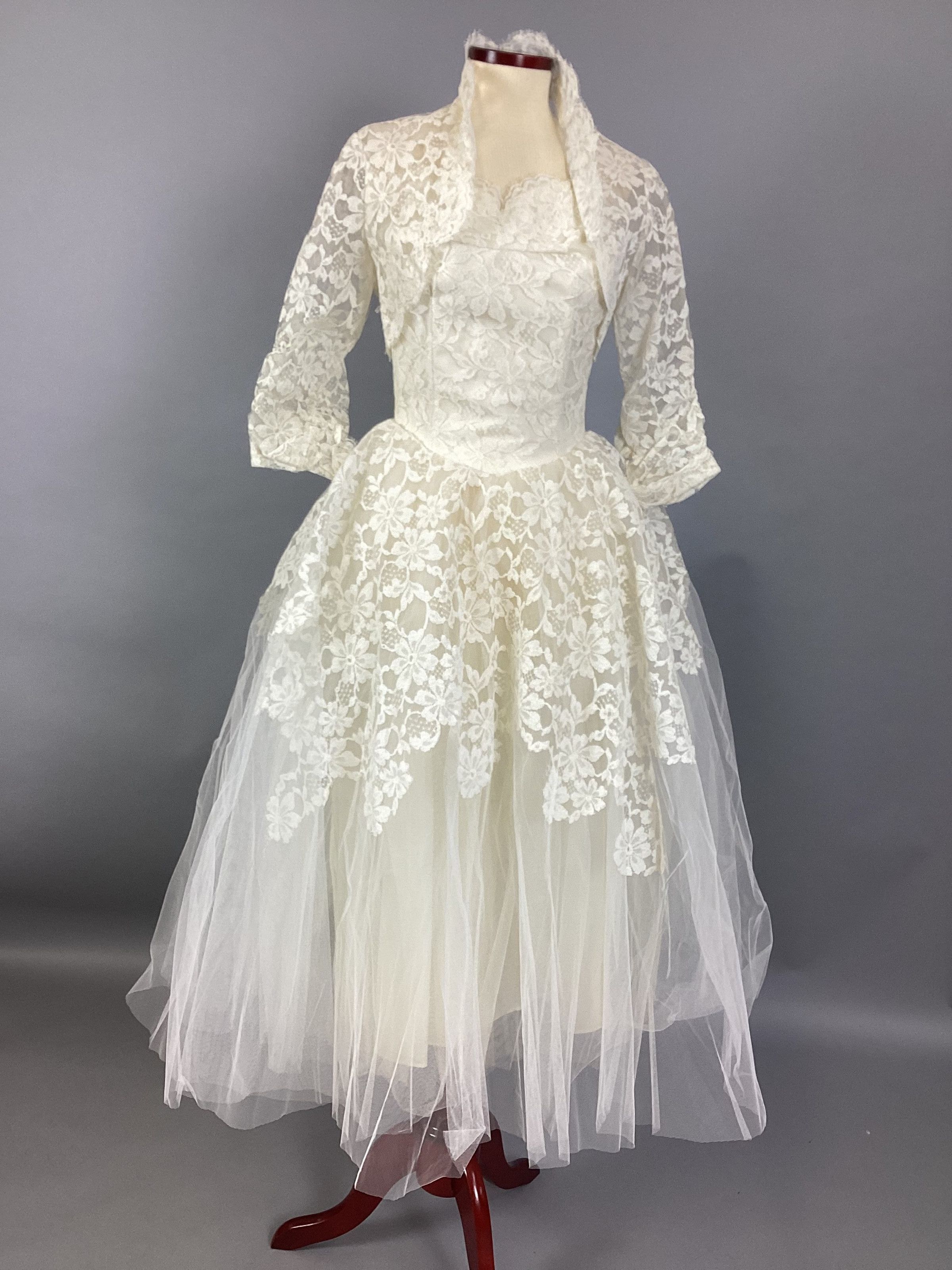 A white lace and organdy wedding dress with a matching bolero. The dress is sleeveless with a sweetheart neckline, a lace bodice, and a lace overlay over the full organdy skirt. The bolero is made entirely of white lace. Sub-numbered A & B.