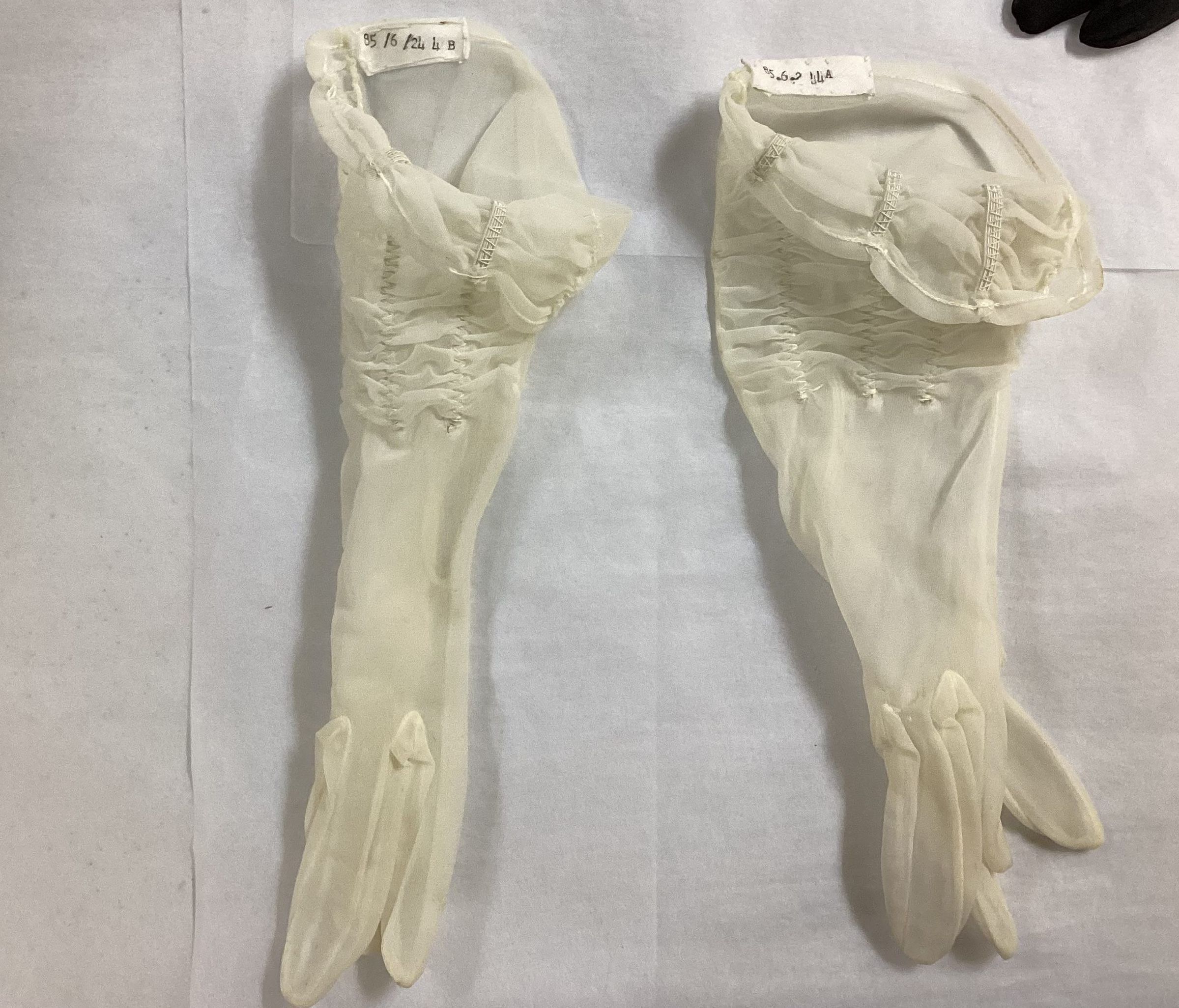 White, nylon ladies gloves; 3 1/2" sheering attacked to three quarter inch elastic forms back cuff; 1 1/2" elastic attached at front wrist.
