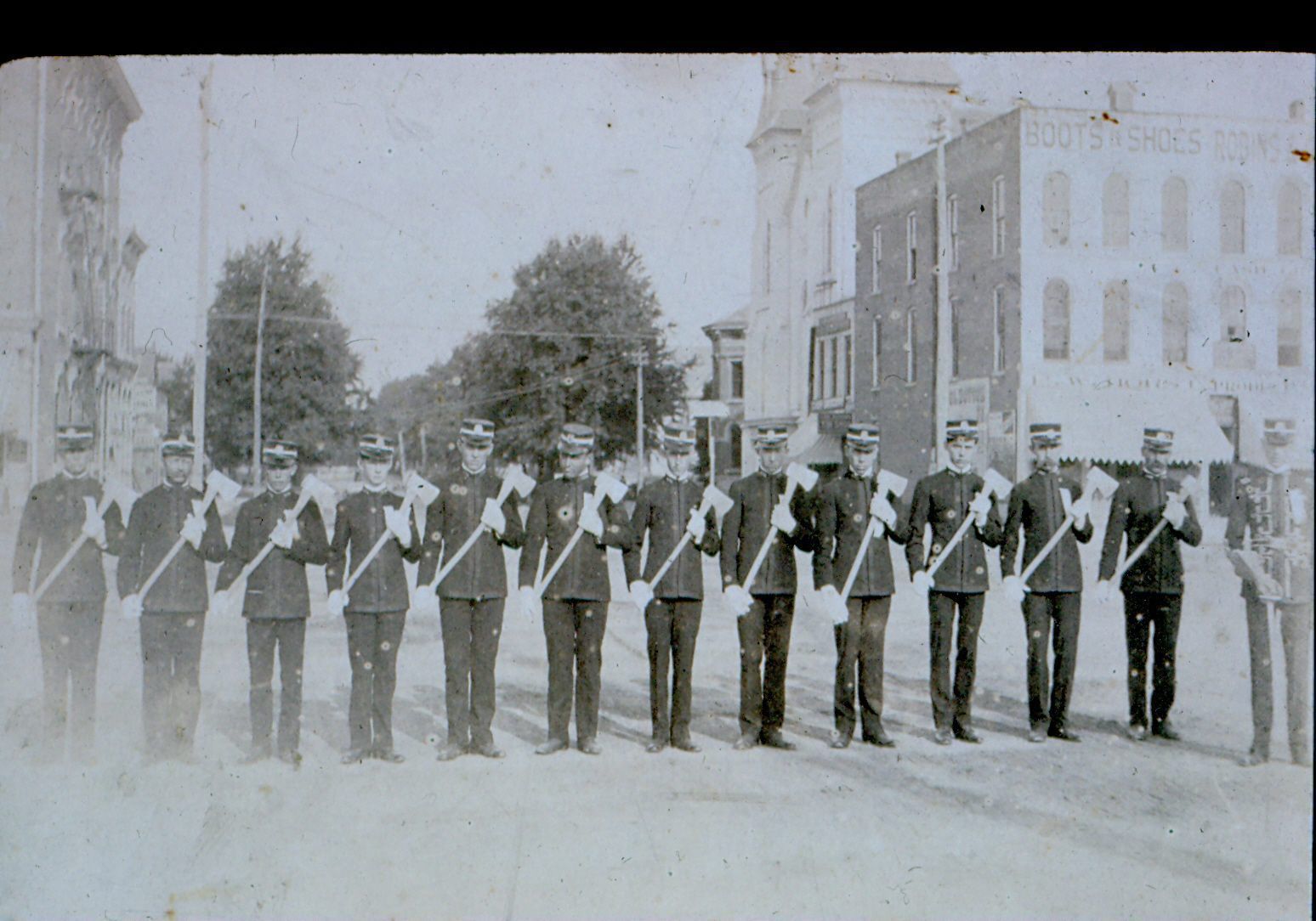 Donation, 07/26/2005. Black and white photographic slide in landscape format. Slide frame is marked: "Public Square N.W./Modern Woodmen" Image is of 13-14 men in uniform with axes lined up in a single row.Collection