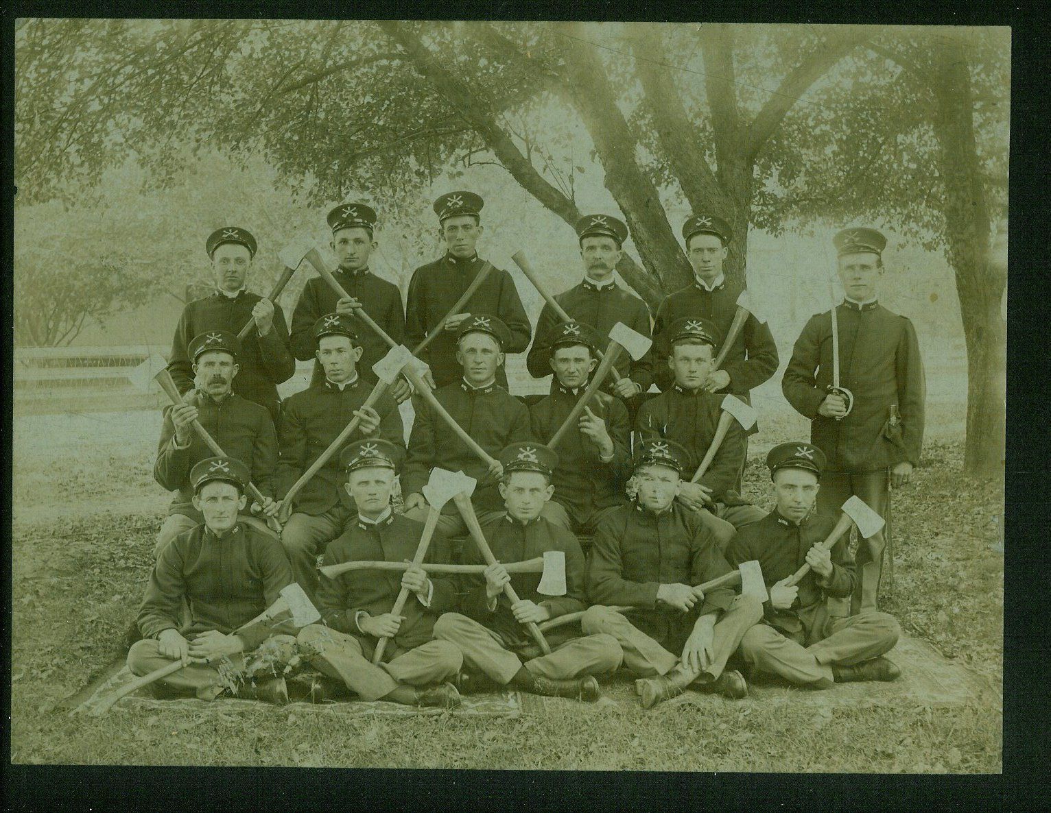 Sepia photographic print in landscape format. Image is of sixteen men in uniform with axes. On front row three axes have been used to form an "A." The
