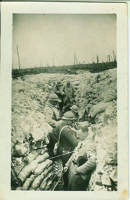 Black and white photographic snapshot print in landscape format. Image is of a World War 1 battle scene showing soldiers in a trench.Collection