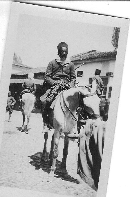 Black and white photographic snapshot in portrait format. Image is of a native of the are sitting on a horse.Collection