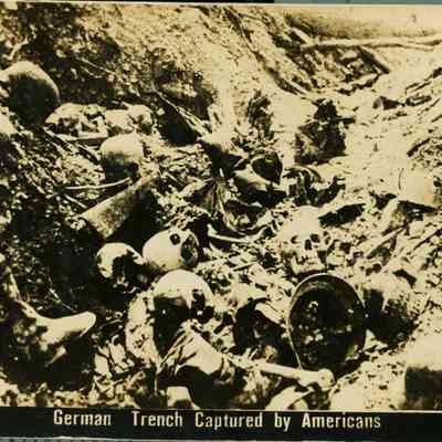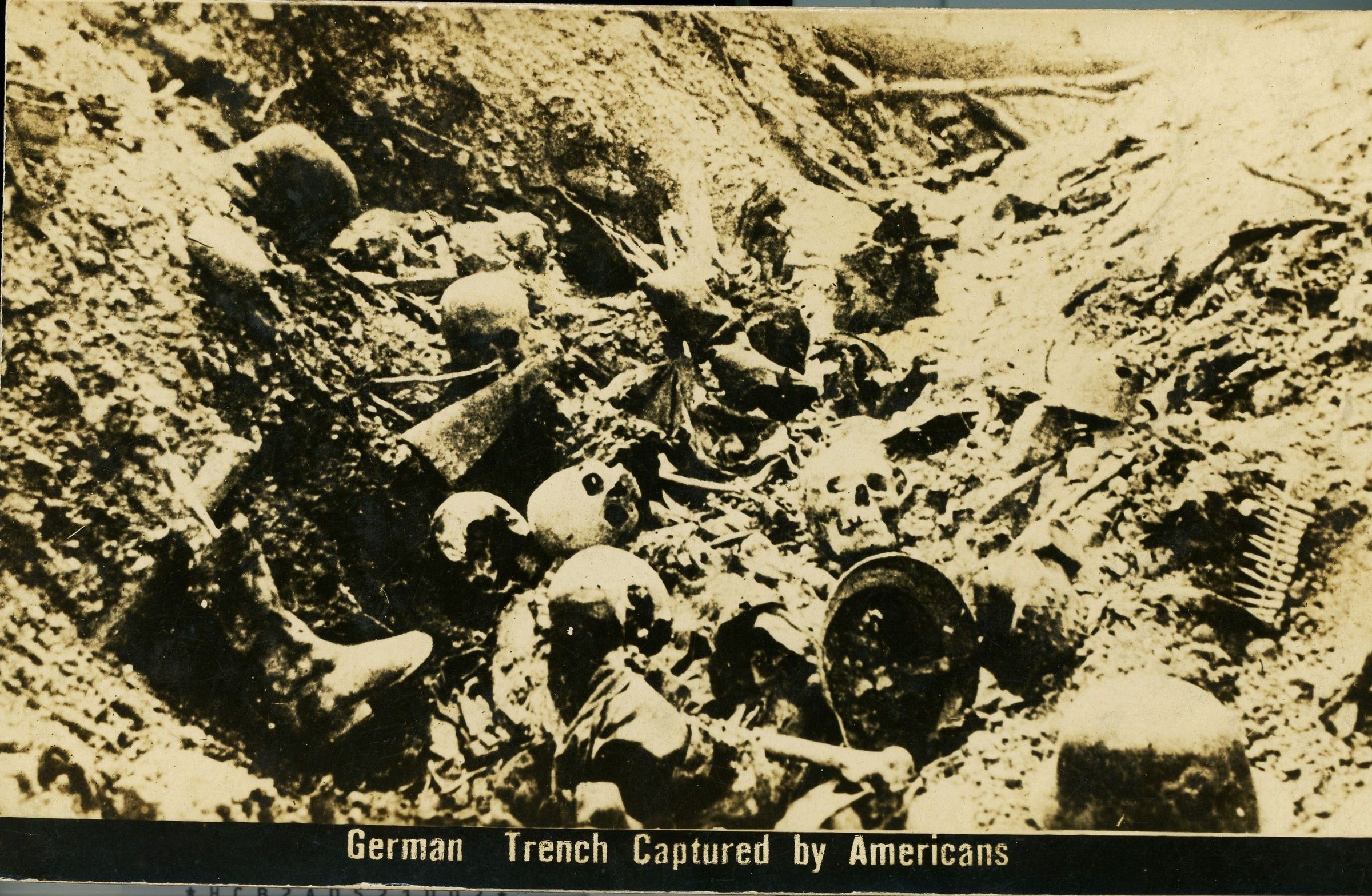 B: black and white postcard marked at bottom front: "German Trench Captured by Americans". Image is of trench with skulls, helmets, boot with bone protruding, other bones. Donation, Dec., 1990 from Lindsay Howell. Used by Foster James Howell.Collection