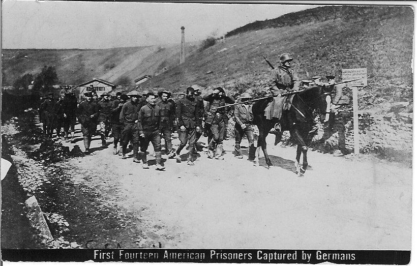 A: black and white postcard marked at bottom front: "First Fourteen American Prisoners Captured by Germans". Image is of American prisoners marching behind a German on horseback.