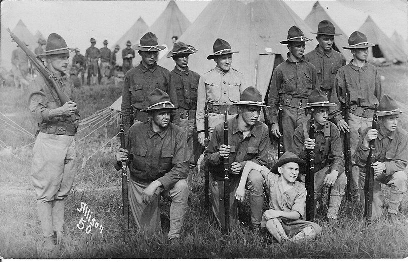 Photographic postcard in landscape format. Image is of 11 men in WW1 army uniforms. There is a small boy in front wearing lighter-colored garment with leggins and hat; tents in background and other soldiers; man at left holding gun on shoulder; stamp on card. Addressed on back in black ink: "Mr. J. H. Whitece/55 S. Mount St./Indianapolis, Ind."Collection