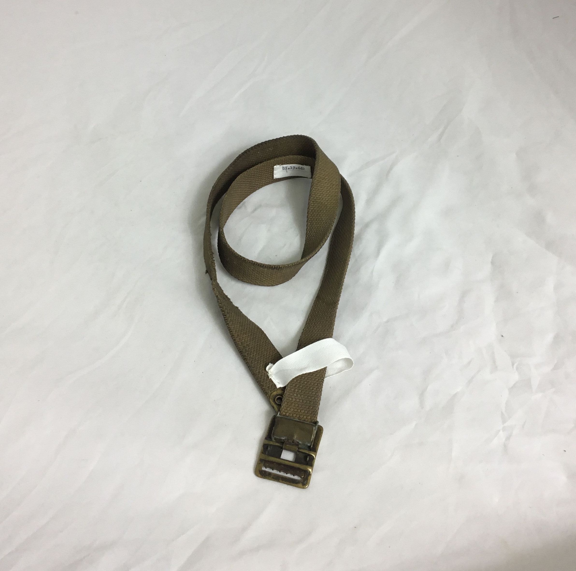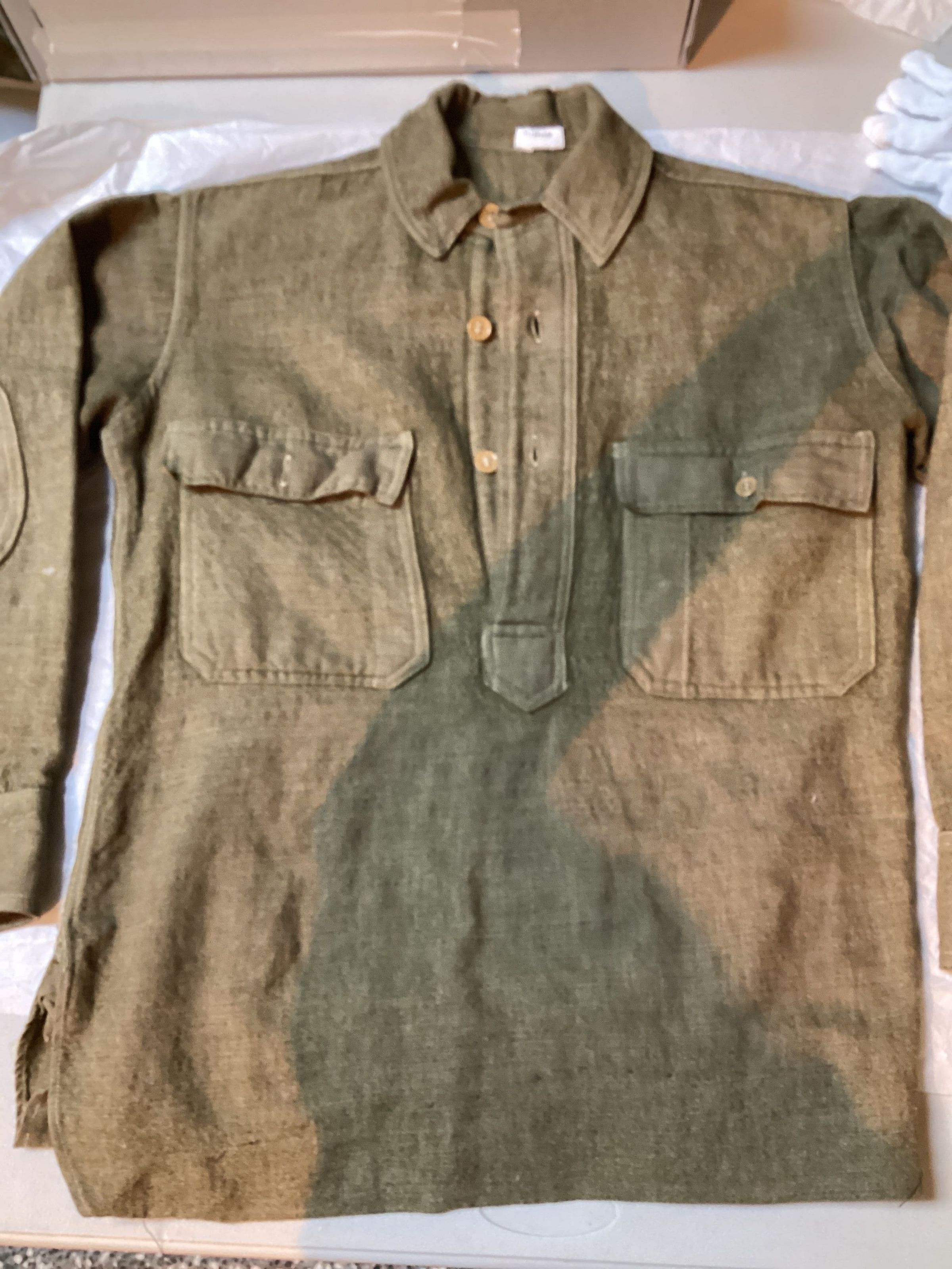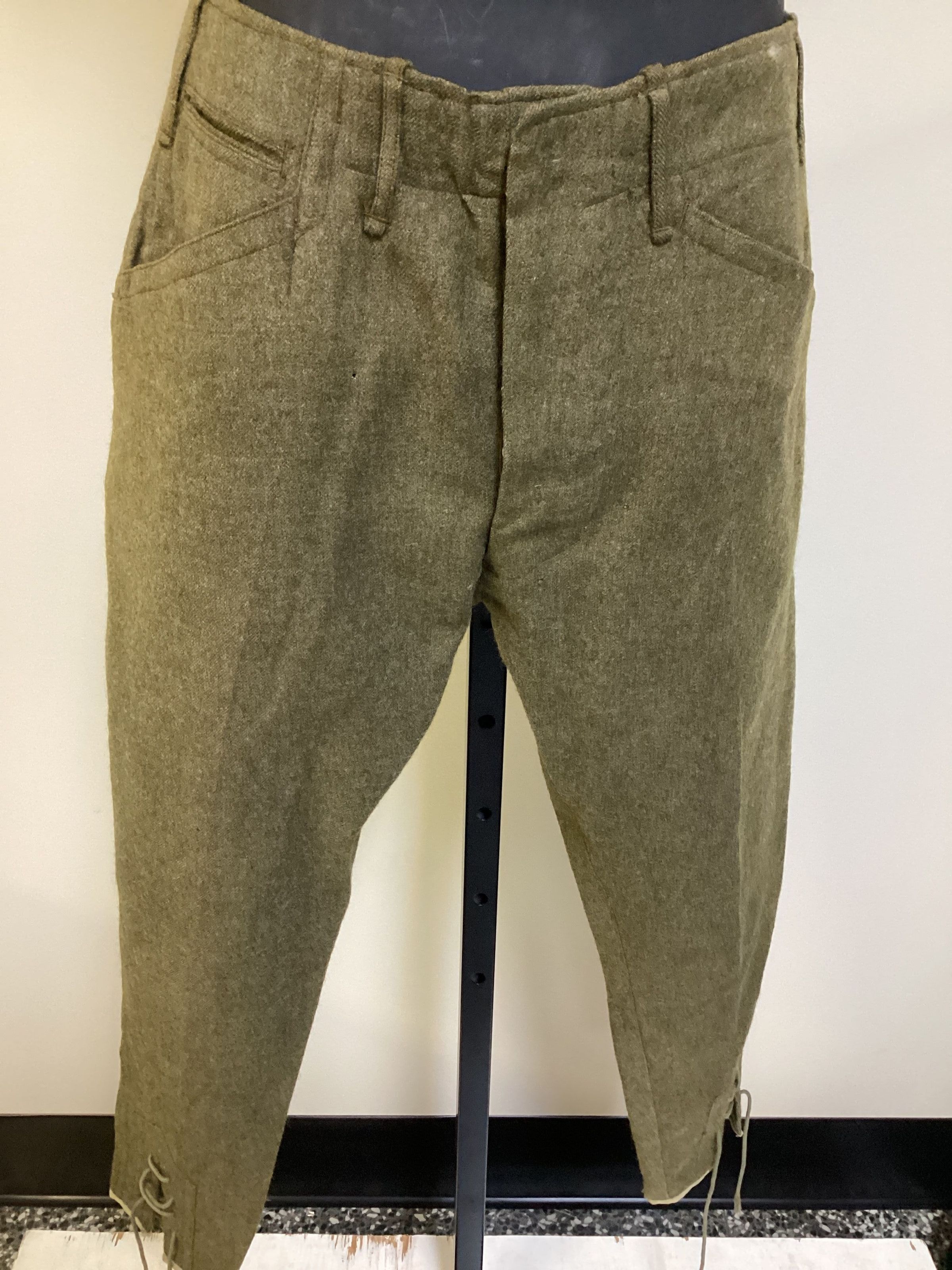 Private's uniform of A: tunic, B: blouse, C: pants, D: belt, E & F: two pattees. A: Wool dark green jacket has 5 metal buttons for front closure with army insignia. 4 smaller buttons of this type are on the flaps of the 4 front pockets and 2 on the epaulets. B: Blouse is of a lighter weight wool, same color as tunic, with 3 light brown buttons on placket in front. This placket goes about halfway down the front. There are 2 pockets on front; the left one has a button on flap and the button is missing on right one. C: Jodhpurs of wool whose weight is heavier than blouse and lighter than tunic. 3 buttons close the fly. The bottom of each pant legs has 10 eyelets to thread a lace for tighter fit.Collection