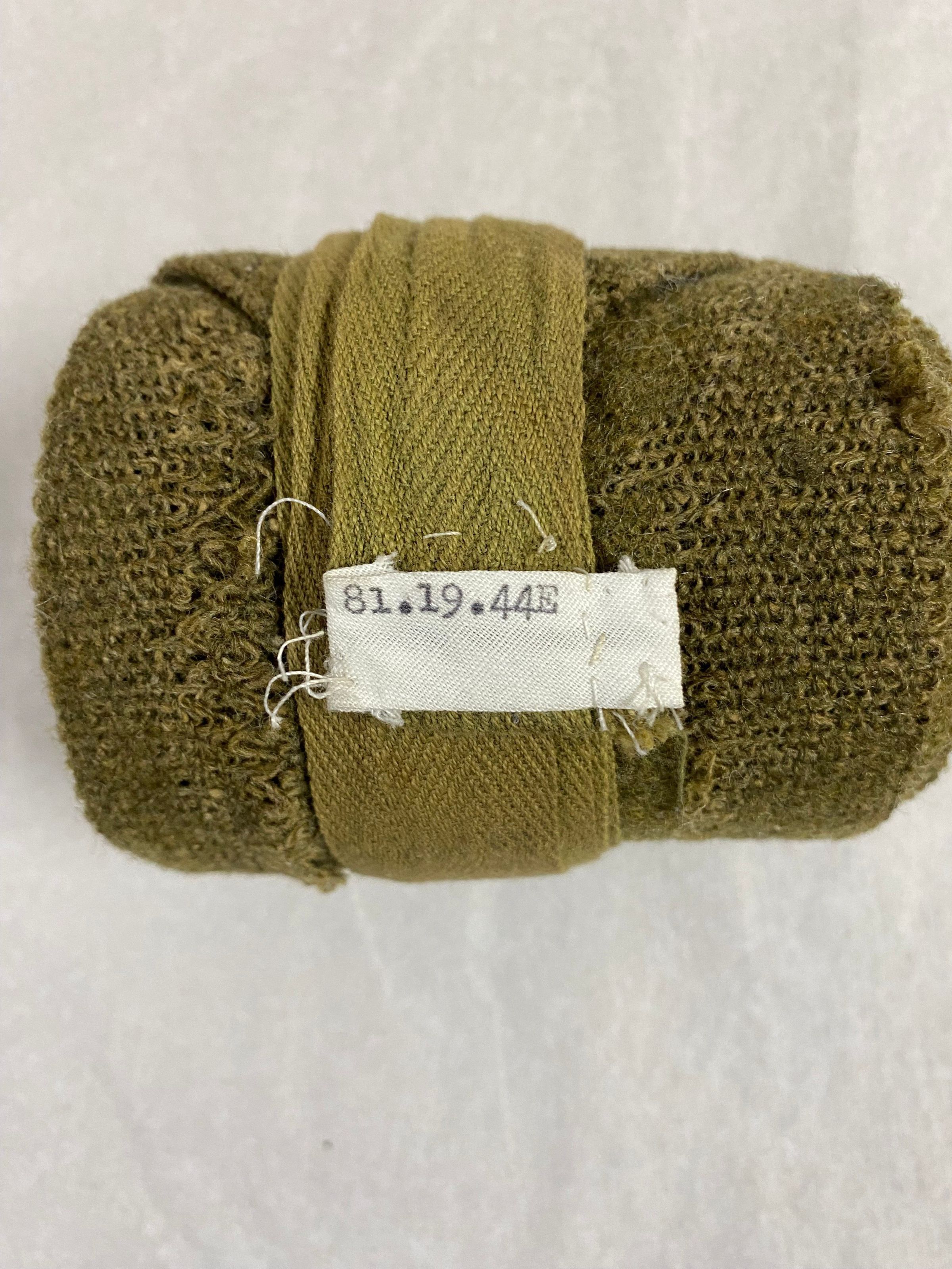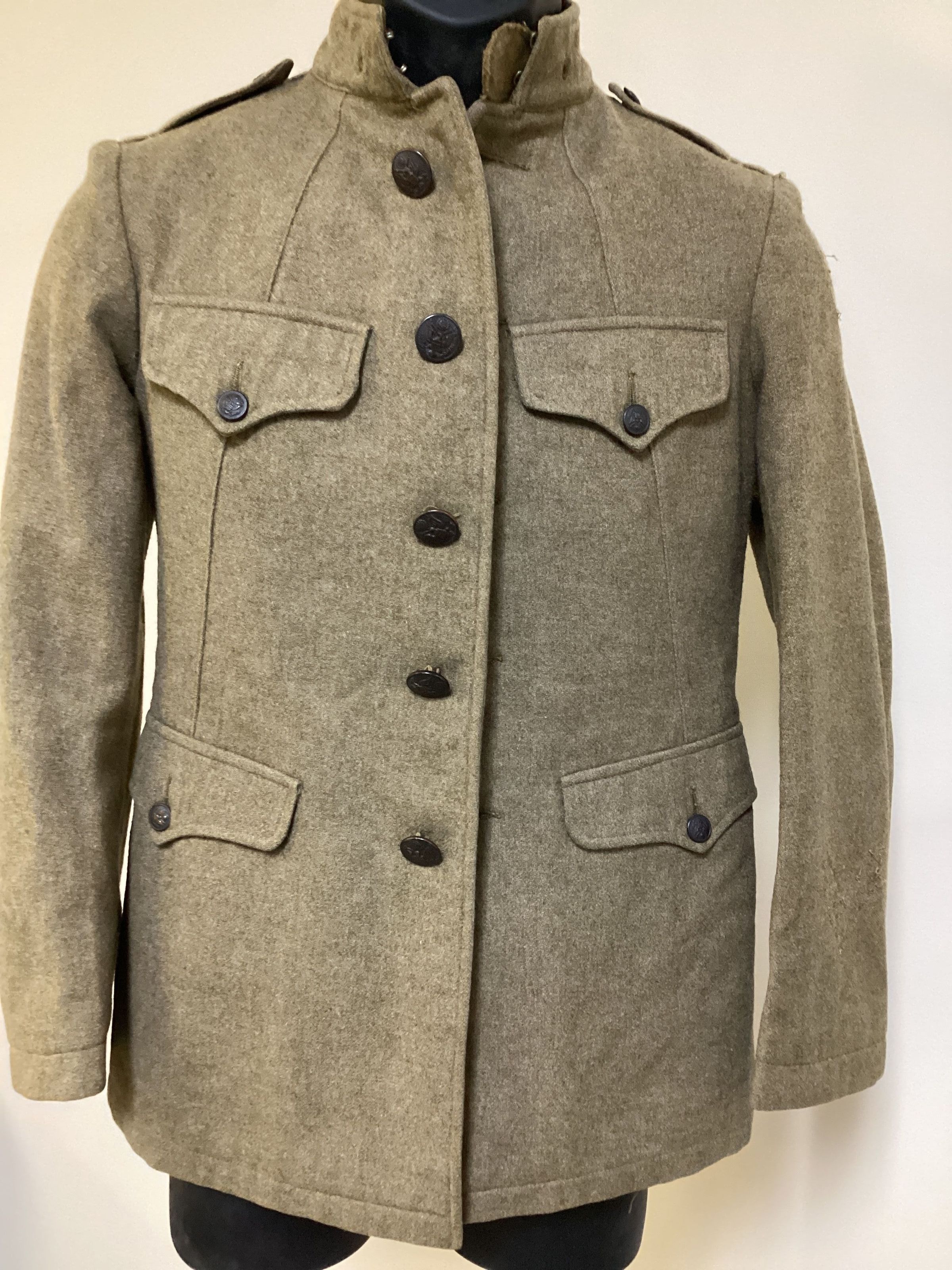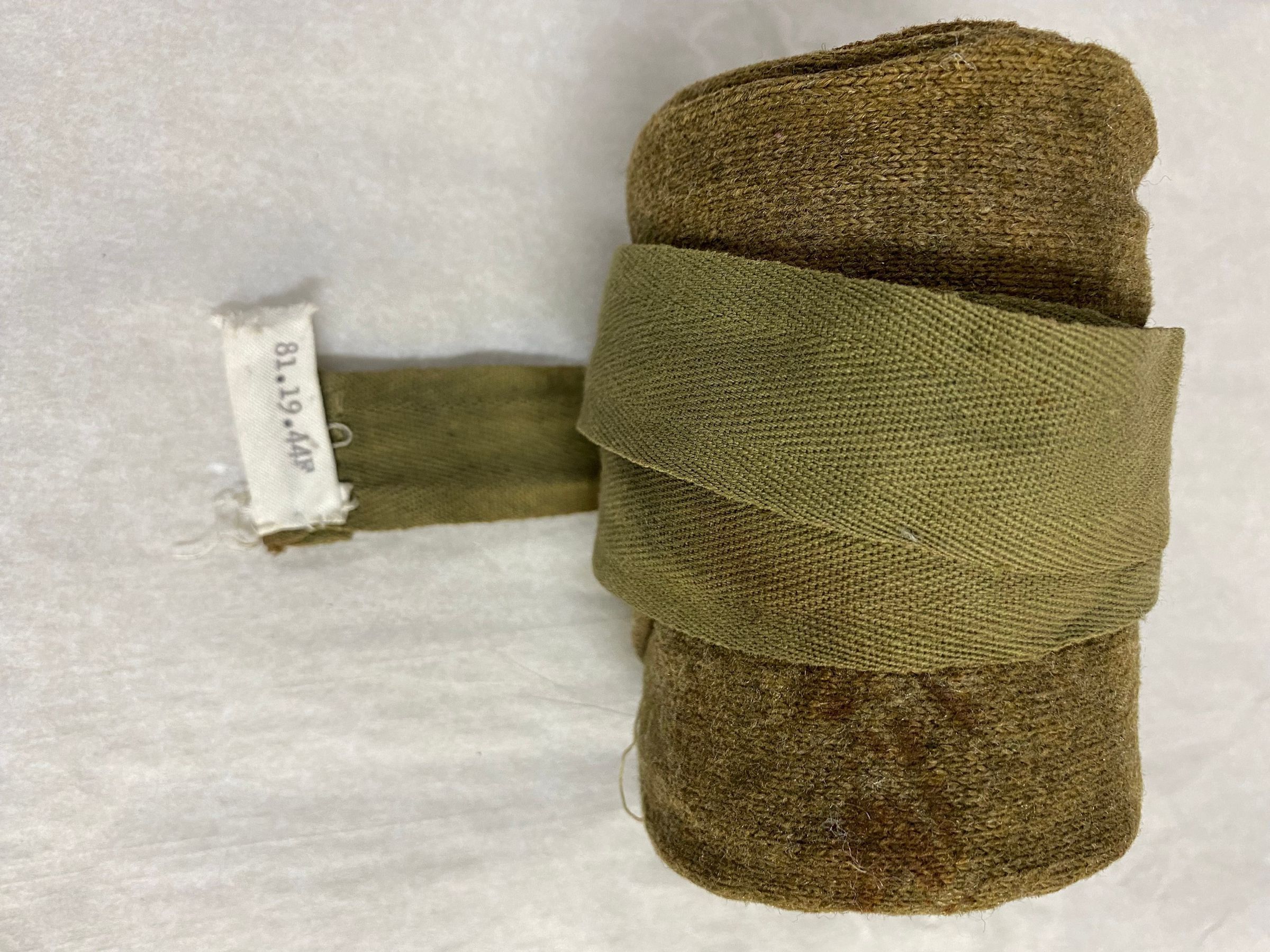 Private's uniform of A: tunic, B: blouse, C: pants, D: belt, E & F: two pattees. A: Wool dark green jacket has 5 metal buttons for front closure with army insignia. 4 smaller buttons of this type are on the flaps of the 4 front pockets and 2 on the epaulets. B: Blouse is of a lighter weight wool, same color as tunic, with 3 light brown buttons on placket in front. This placket goes about halfway down the front. There are 2 pockets on front; the left one has a button on flap and the button is missing on right one. C: Jodhpurs of wool whose weight is heavier than blouse and lighter than tunic. 3 buttons close the fly. The bottom of each pant legs has 10 eyelets to thread a lace for tighter fit.Collection