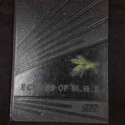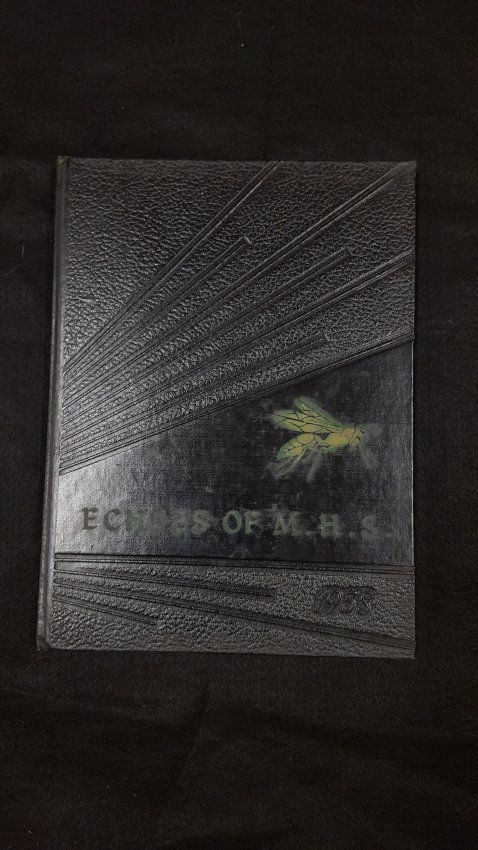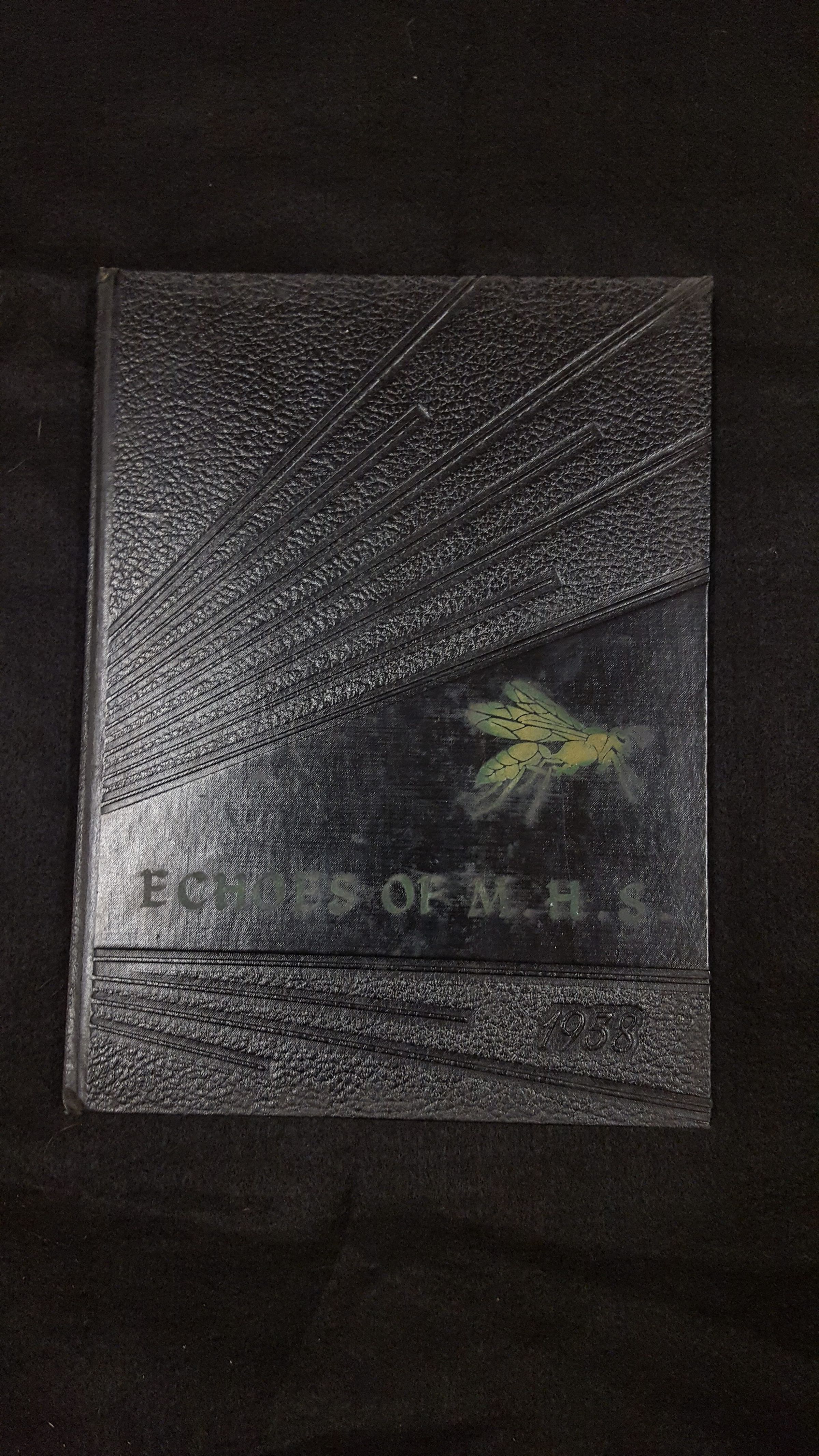 Morristown High School 1958 yearbook. Belonged to VIrginia Williams and Terry Wells (sisters). contains photos of students, faculty, sports teams, and other extracurricular activities. Inside front and back covers have a photo of the class of 1958. The outside front cover is mostly textured with parallel diagonal lines, a picture of a yellow jacket and says, "ECHOES OF M.H.S." Along the bottom. Back cover has a seal on the bottom right corner.Collection