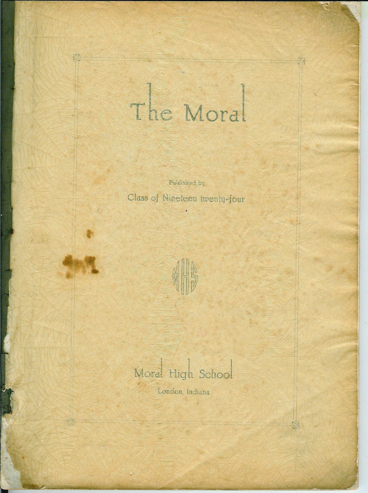 "The Moral," a yearbook published by the Moral High school graduating class of 1924,London, Indiana, 64 pages.