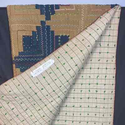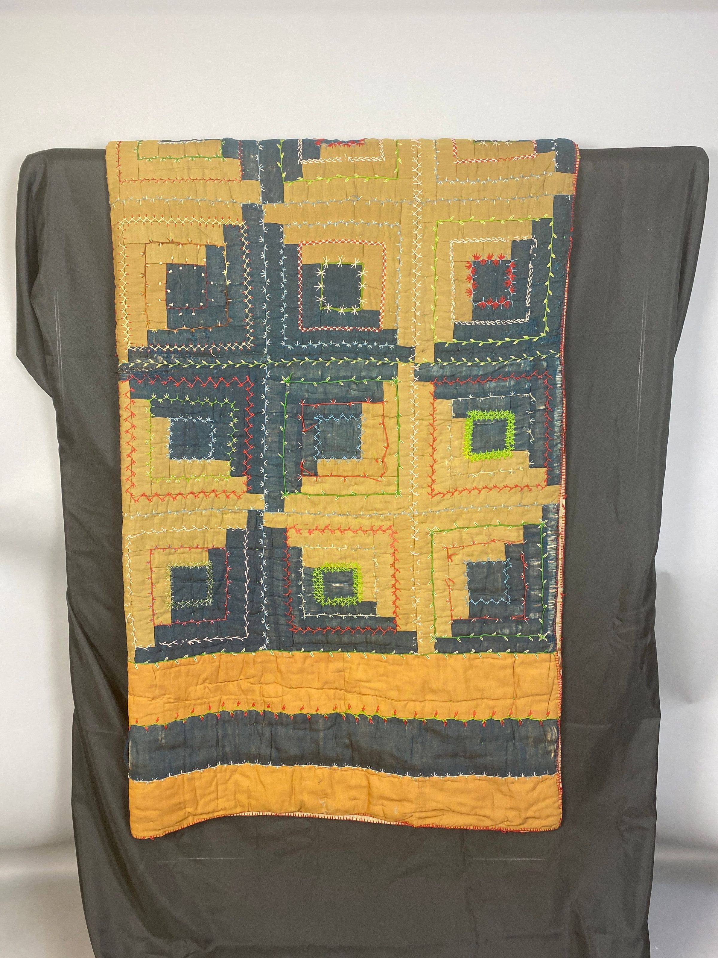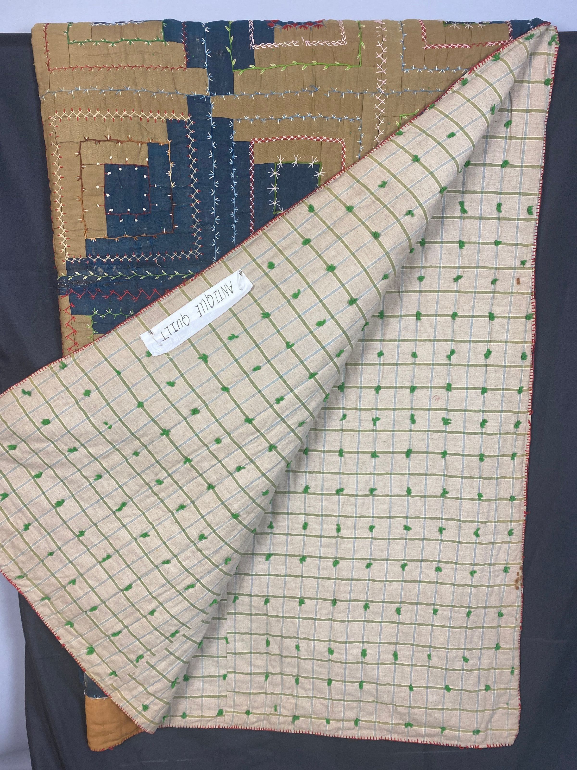 Comforter in navy & tan, 12" square, pieced in log cabin pattern. 6 squares long and 4 squares across. Along each side are three 5 1/2" strips, two gold, 1 navy. Along each seam is embroidered stitch. Comforter is backed with outing flannel, green plaid on grey. It is knotted with green yarn, blanket stitch in red around edge.Collection