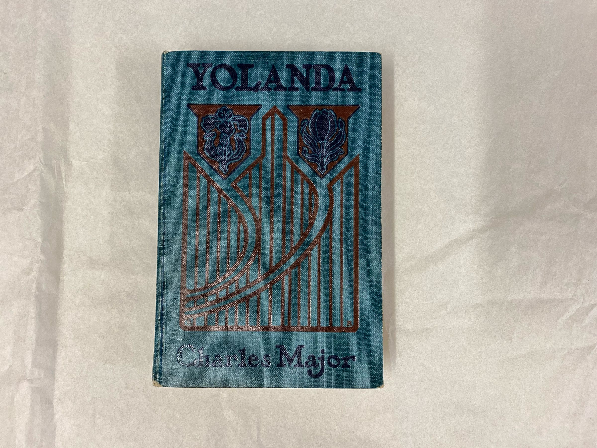 A blue-green hardcover copy of "Yolanda" by Charles Major. The book's title and the author's name appear in bold navy blue type at the top and bottom center, respectively. Beneath the two types is a stamped illustration of two emblems / crests, with a decorative illustration evocative of an iron gate set between them in brown. The two crests are outlined in navy blue and predominantly filled with brown. On the left, an open flower is outlined and partially filled with navy blue. Negative space reveals the blue-green hardcover. On the right, the flower is closed. This photoplay edition, the Marion Davies Edition, includes photographs of American actress Marion Davies as she appeared in the novel's 1924 film adaptation.Category