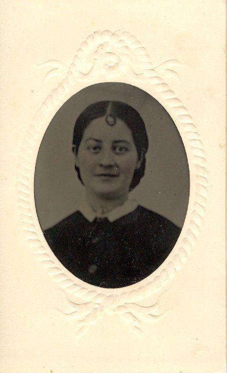 Image is a young adult female with a button-collar neckline. Hair is center-parted and combed to the back with a single loop curl in the center of her forehead; dark dress with center buttons and a white collar; white paper frame is embossed with a rope pattern around the oval opening for the tintype; cheeks have been tinted with pink.Collection