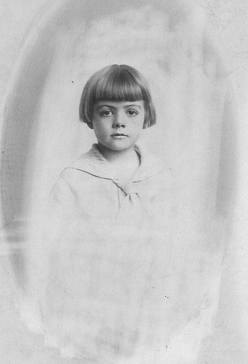 Black & White image of young child with a Prince Valiant haircut; large dark eyes; clothing is light colored; has sailor suit type of collar and knotted scarf at neck; rest of image is opaqued out.