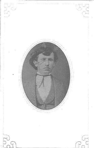Donation 05/91 from Jack Warble. Small tintype 1 1/3" x 2" showing a shoulder view of a young man, hair below his ears, bangs in front. Coat and collared vest