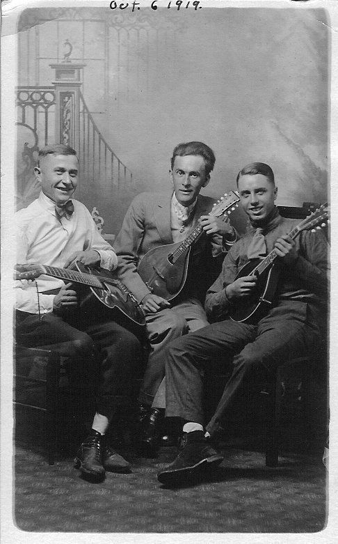 Three young men with musicl instruments; one on left has a guitar; other two have mandolins; one on the left has white shirt and dark bow tie; one in center has suit and print shirt; one on right has dark shirt and lighter tie.Collection