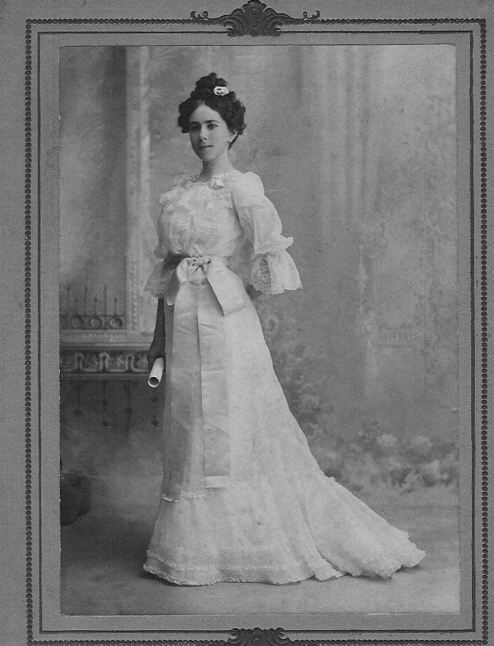 b & w print (5 1/2" x 3 13/16") on gray color mount, w/beveled edges & embossing around print for frame effect; full length view of young woman standing at slight angle to camera w/left shoulder foremost; dark hair curled above ears & put up in intricate knot on crown & appears to have flower in knot at crown; wearing long white lingerie dress; square neck, 3/4 length sleeves end with long lace section, sash at waist tied large bow w/ends hanging well below knees,skirt has train; left hand behind back; right hand holding rolled paper. Suspect is a graduation pictureCollection