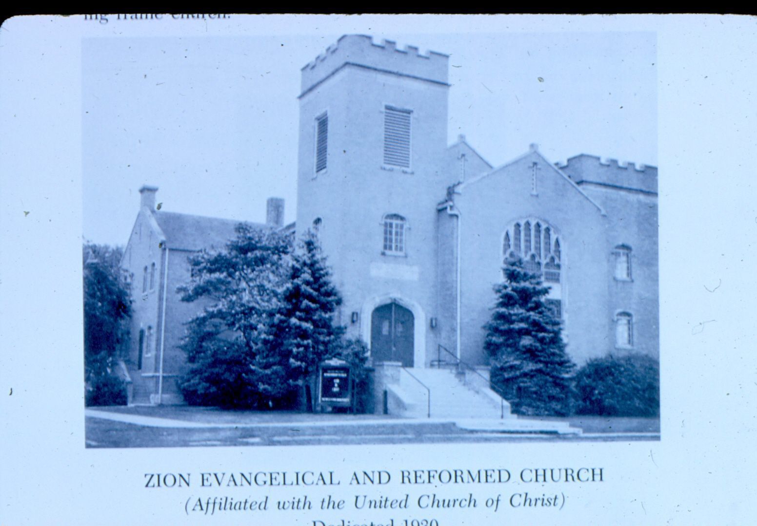 Black and white photographic slide in landscape format. Slide frame is marked: "New Zion Church." This is a slide of a picture in a book. Caption under picture: "Zion Evangelical and Reformed Church/(Affiliated with the United Church of Christ)/Dedicated 1930."Collection