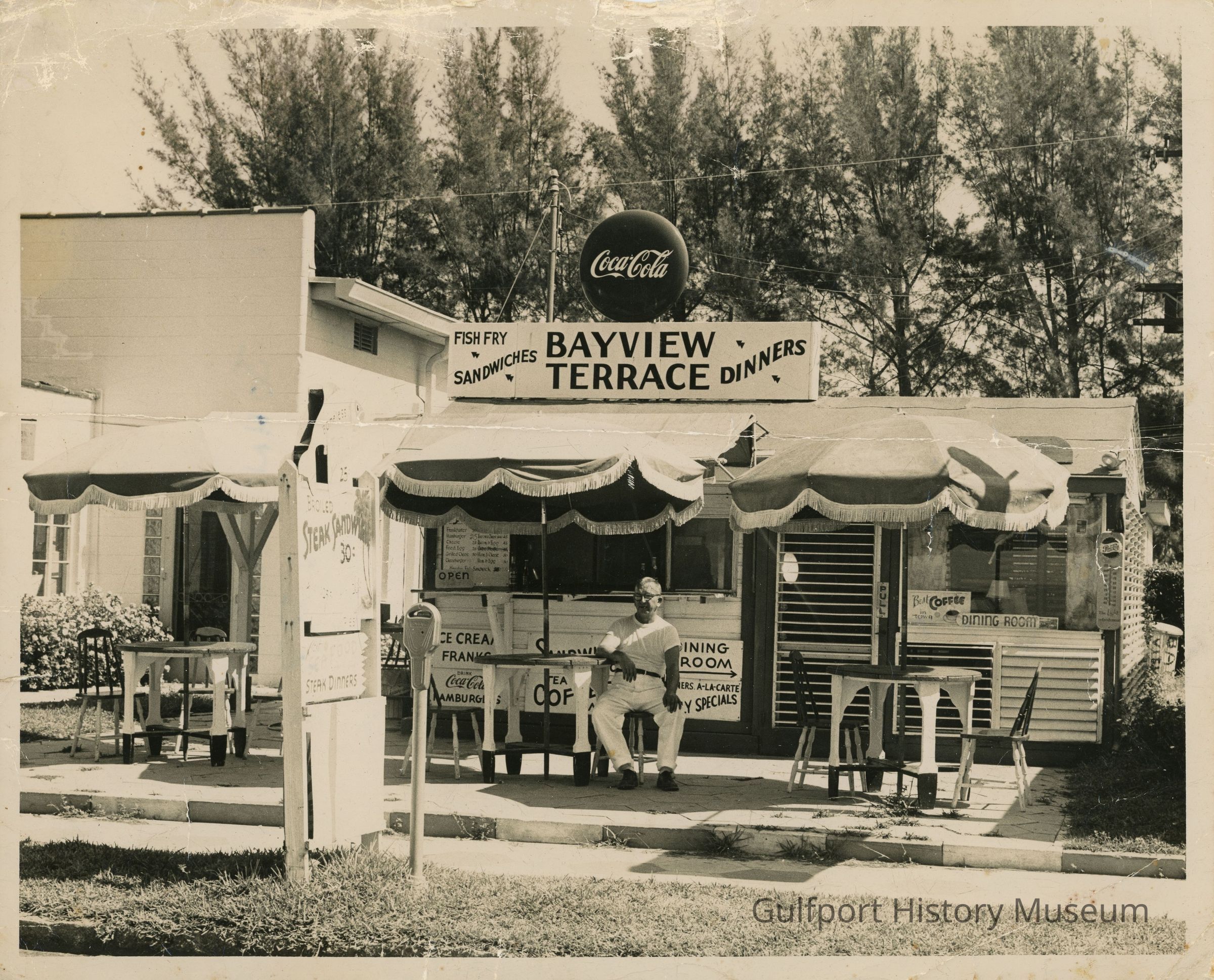 A black and white photograph of the Bayview Terrace Restaurant at 5441 Shore Blvd S. [John Barrett] is sitting on the restaurant's patio. The stand has a sign on top which has a large Coca-Cola cap sign, as well as a Bayview Terrace sign which reads, "FISH FRY * SANDWICHES * BAYVIEW TERRACE * DINNERS *." There are a few tables on the patio, three of which have large umbrellas. The building itself has a service window, counter, and a small indoor dining room.Photograph Details