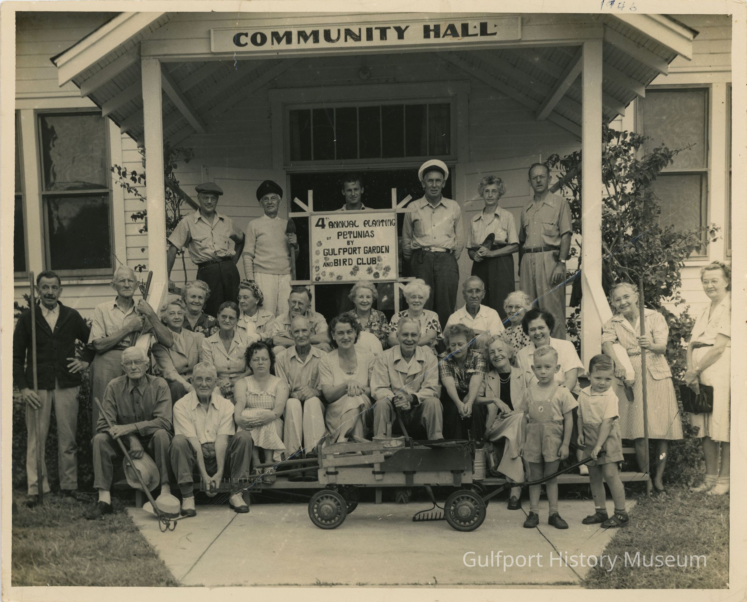 A black and white photograph of the Gulfport Garden & Bird club on the porch of Community Hall (Scout Hall). There is a sign in the middle of the group which reads, "4th ANNUAL PLANTING OF PETUNIAS BY GULFPORT GARDEN AND BIRD CLUB." There is a wagon parked on the walkway near two children, one of which is holding the wagon's pull handle.Photograph Details