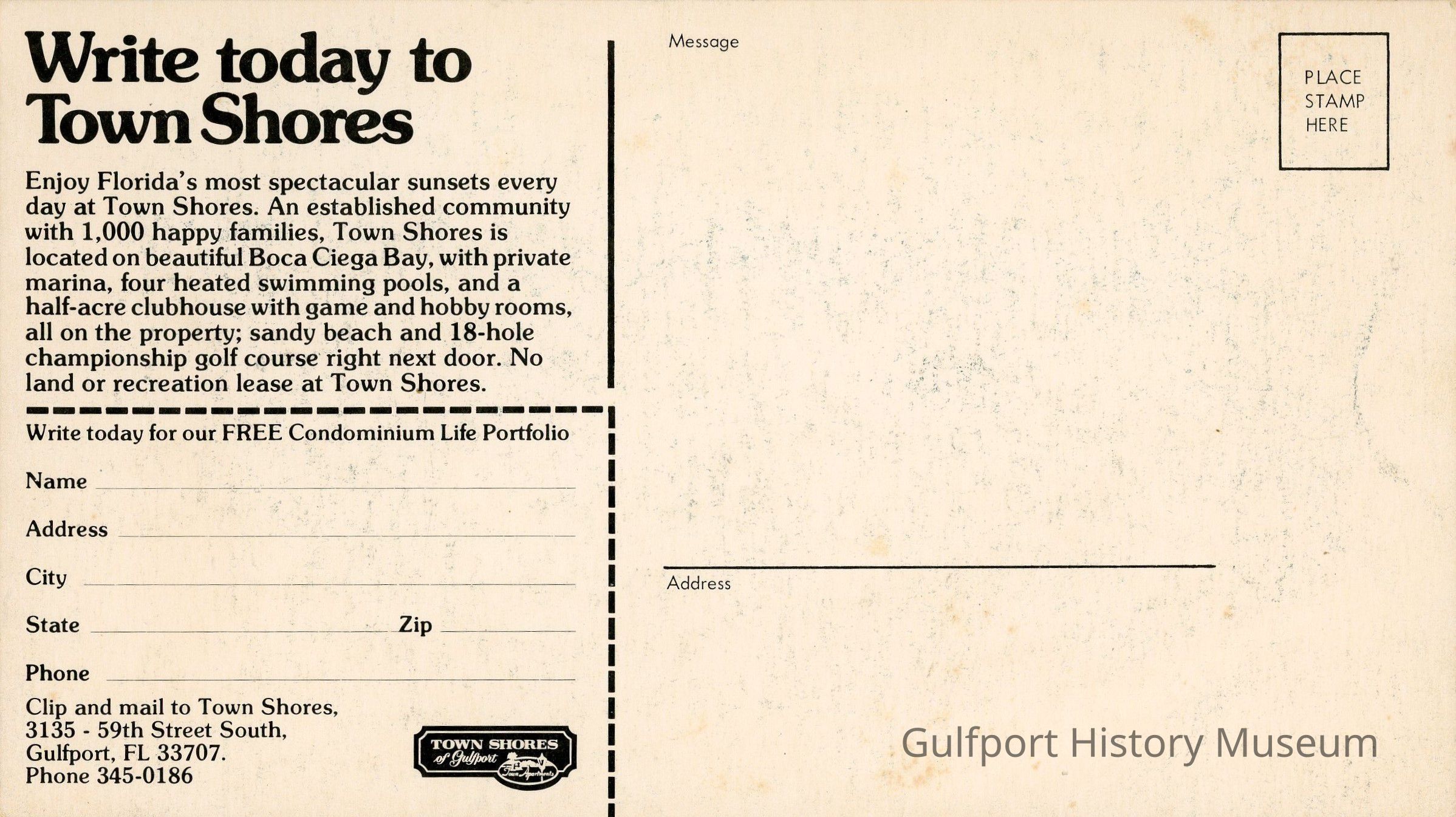 A promotional mailer for Town Shores of Gulfport. A color image shows two people sitting on a bench looking out on Boca Ciega Bay at sunset. The buildings of Town Shores are visible on either side of th eframe.Subject
