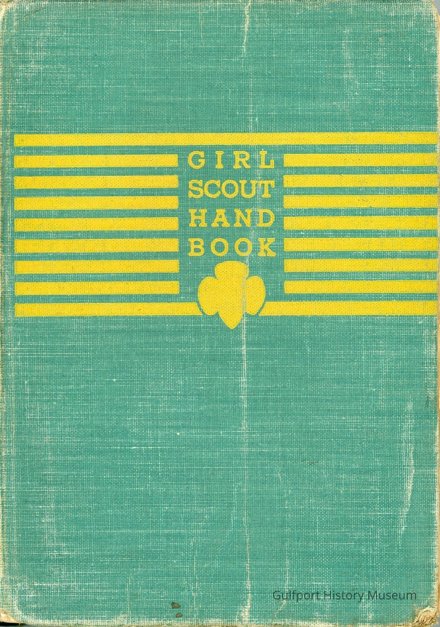 A 1942 Girl Scout handbook. Green with yellow lines and yellow trefoil design.