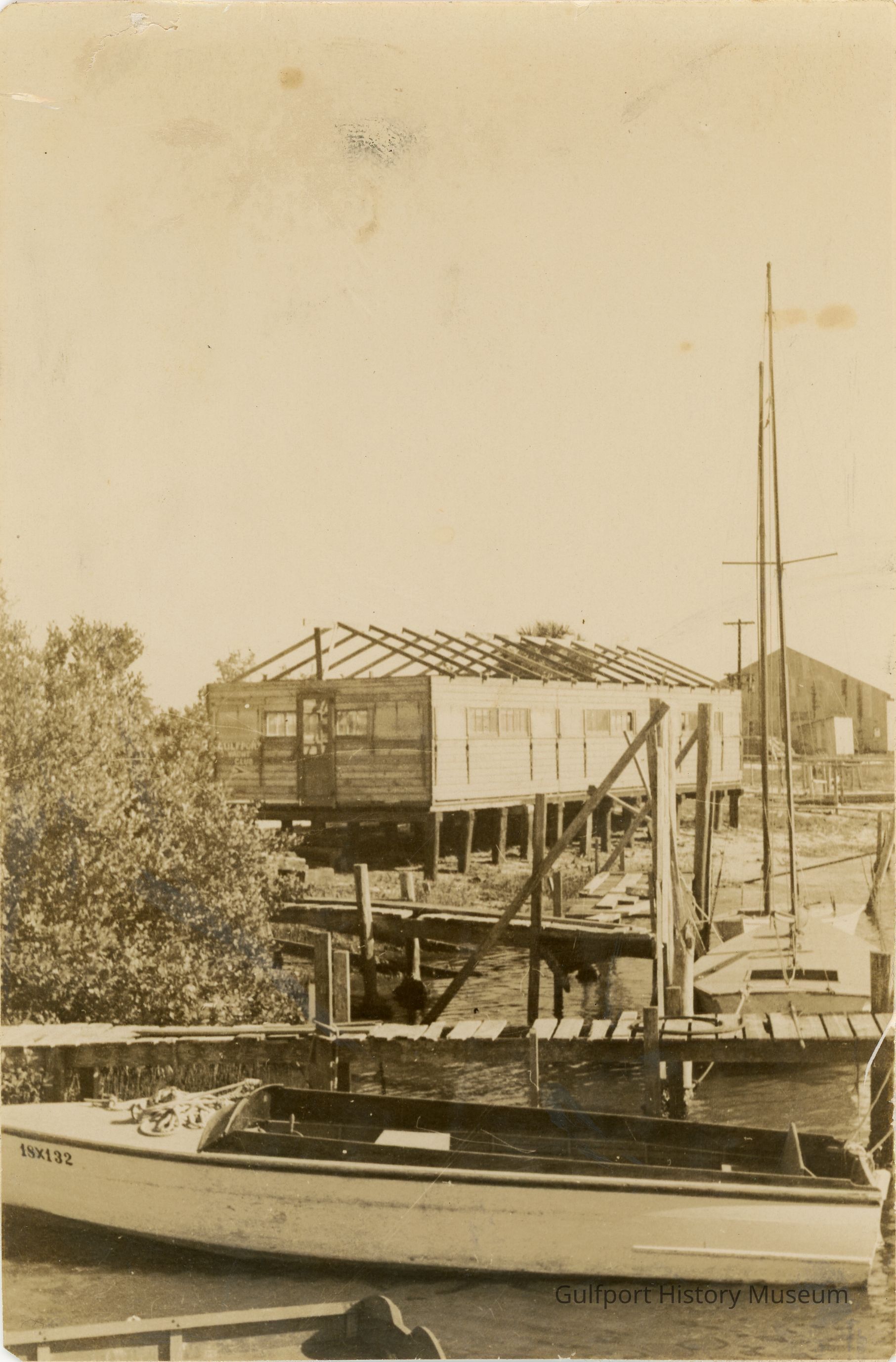 A black and white photograph of the partially constructed Gulfport Yacht Club clubhouse which is elevated on stilts by the water. There is a wooden dock across the foreground and there are a few small boats docked beside it, one of which is labeled "18X132."