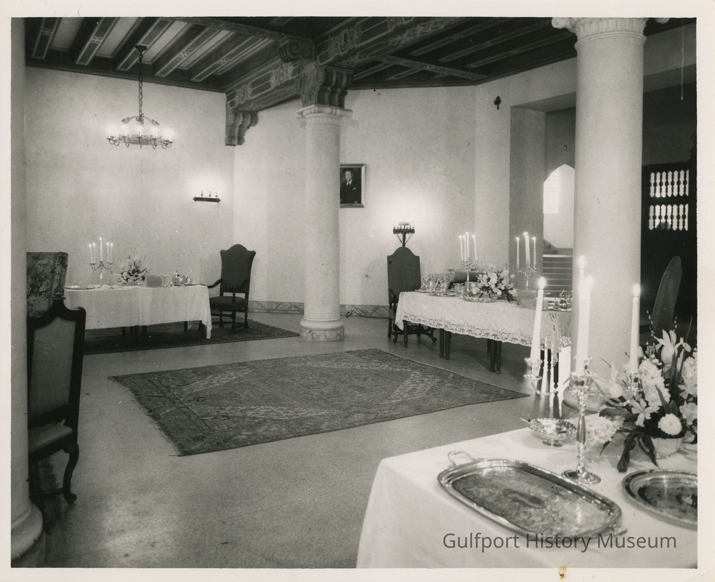 A black and white photograph of the Great Hall at Stetson University College of Law. Several tables with white tablecloths, candles, trays, and floral arrangements are set up around the room.Photograph Details