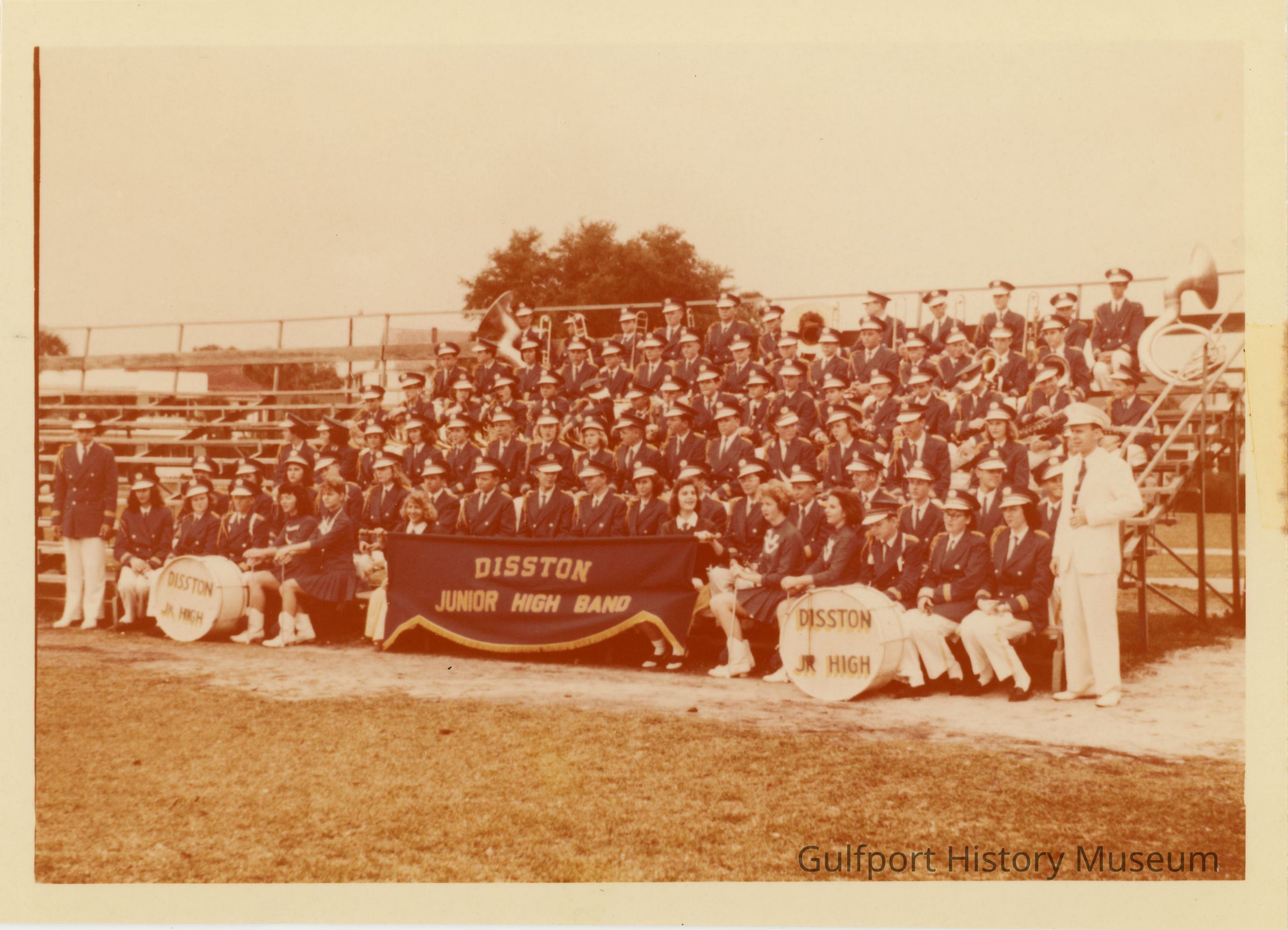 A color photograph of the Disston Junior High Band sitting for a photograph on field bleachers. There are two large drums facing outwards displaying the name of the school. There is a large banner in the center held by those on the lowest level which reads, "DISSTON JUNIOR HIGH BAND."Photograph Details