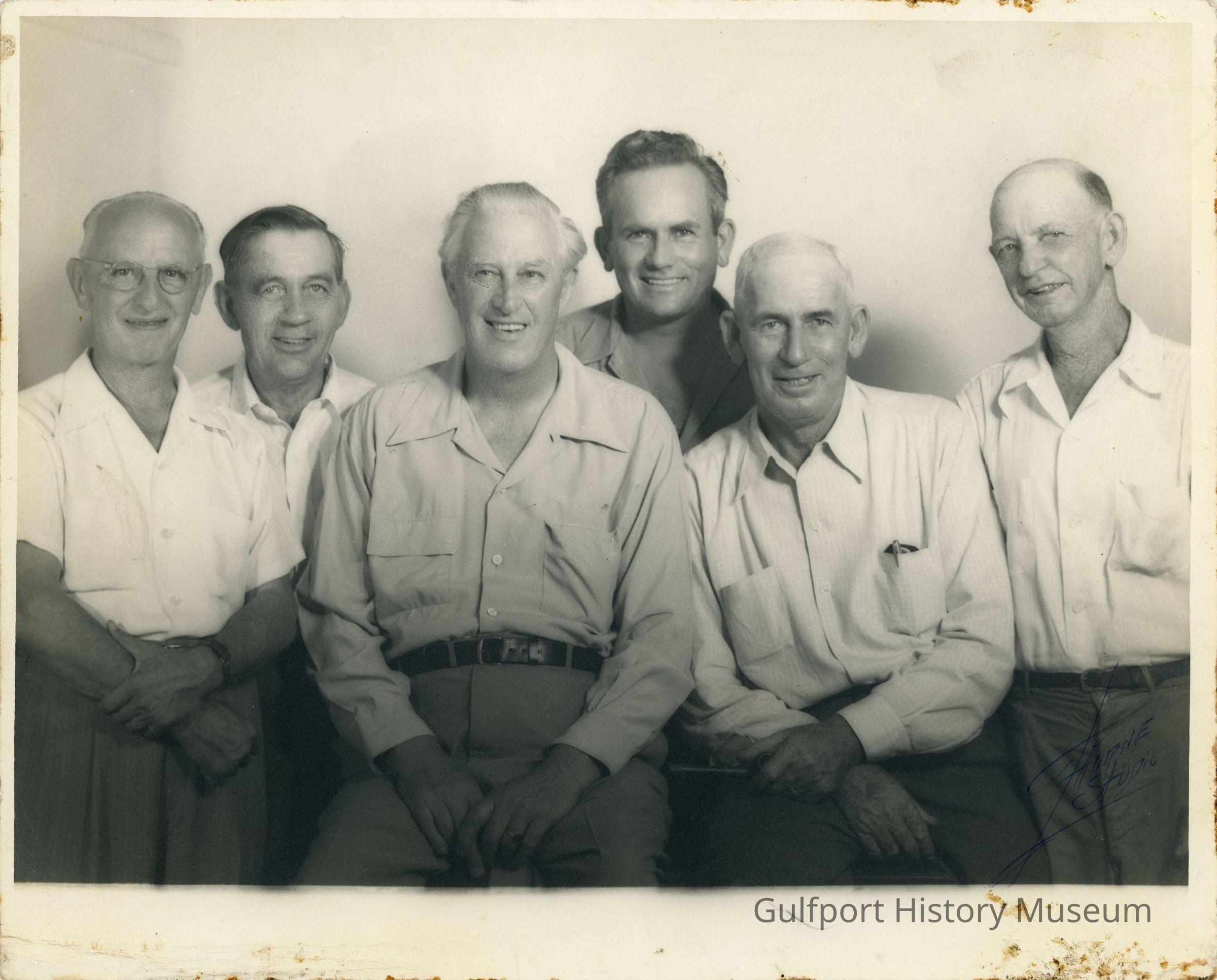 A black and white photograph of the Gulfport City Council and Mayor in 1948. All six men are men wearing button up shirts and slacks with belts.