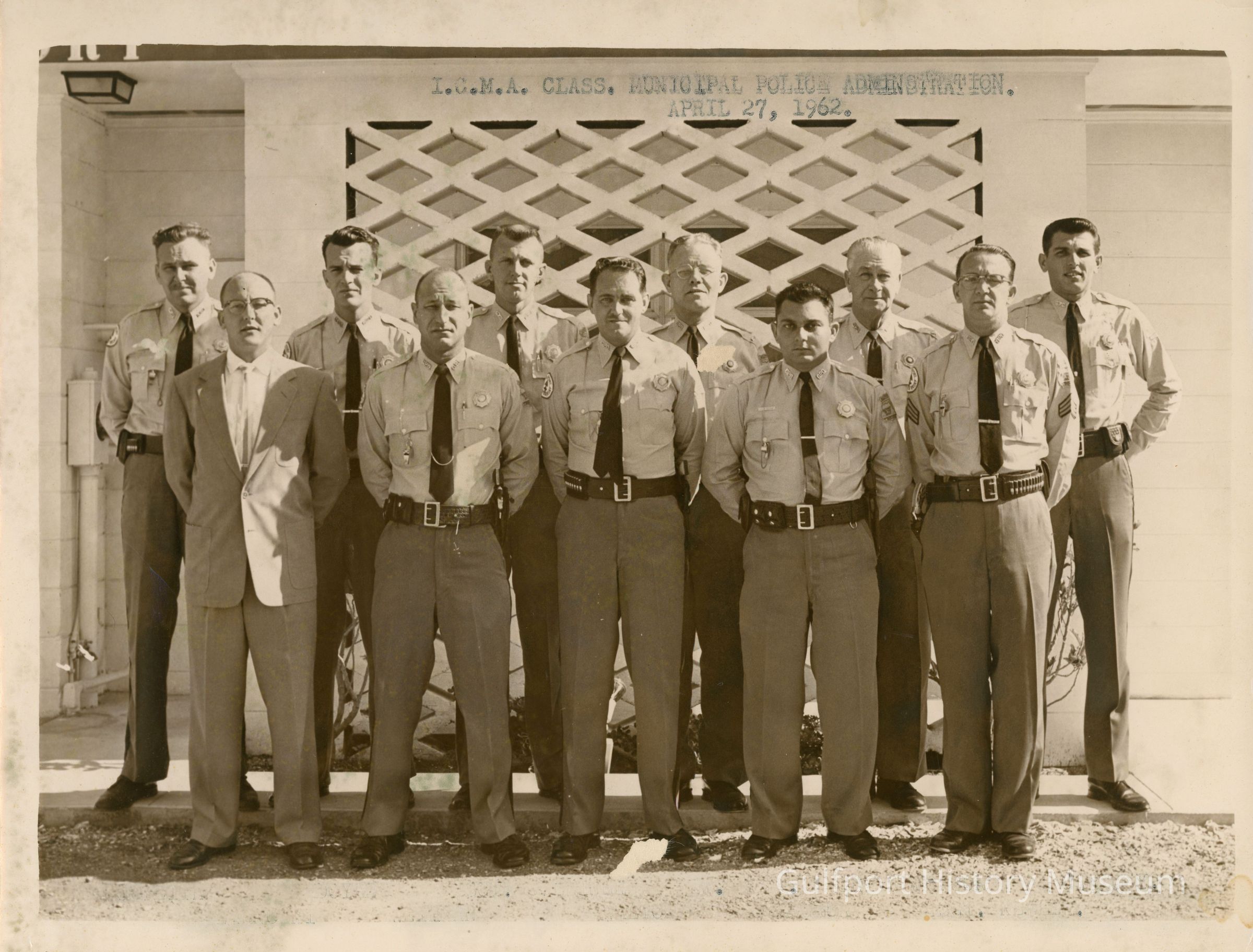 A black and white photograph of two rows of men, all but one wearing police uniforms, standing at attention. Type above them reads: "I.C.M.A. CLASS. MUNICIPAL POLICE ADMINISTRATION. APRIL 27, 1962."Photograph Details