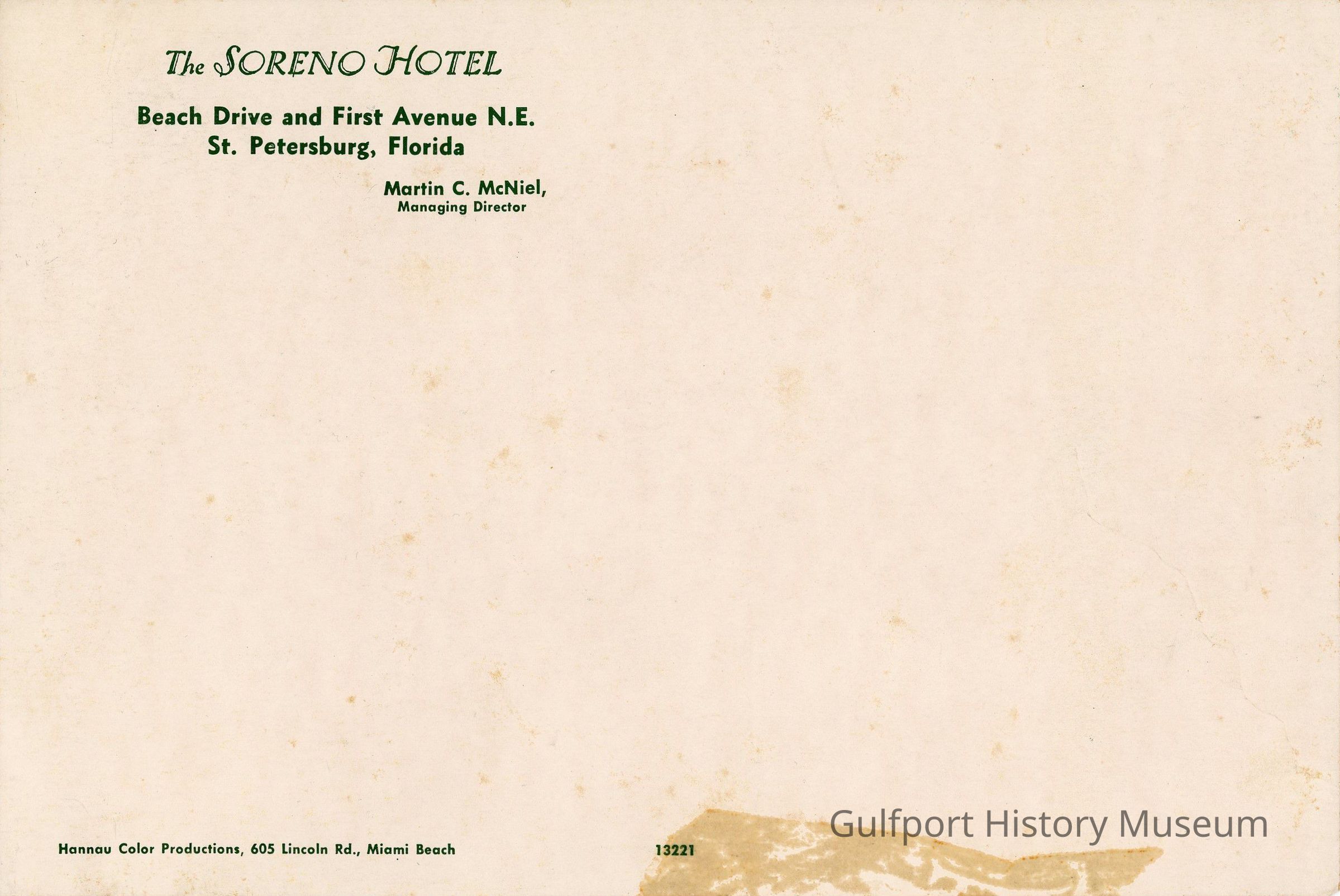 The SORENO HOTEL / Beach Drive and First Avenue N.E. / St. Petersburg, Florida / Martin C. McNiel, / Managing DirectorTranscriber