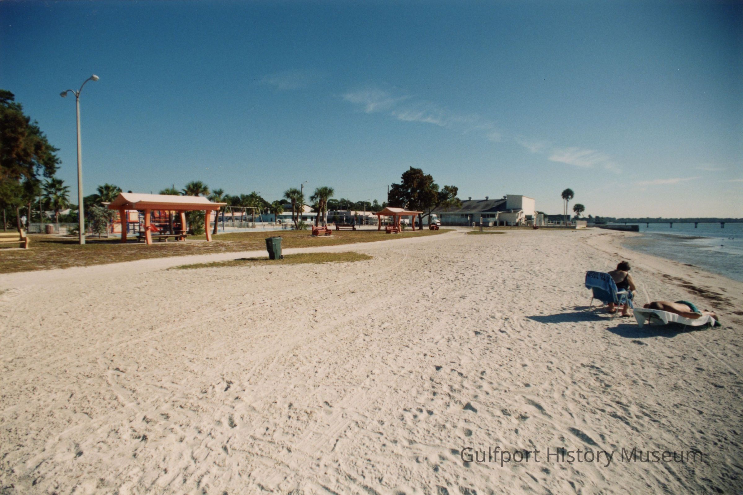 A color photograph of Gulfport Beach looking east. The Gulfport Casino can be seen in the background, as well as part of the Municipal Pier, volleyball courts, and a playground. Two white and salmon-colored picnic shelters stand along the beach in the grass. In the foreground, two people are sunbathing on beach chairs.Photograph Details
