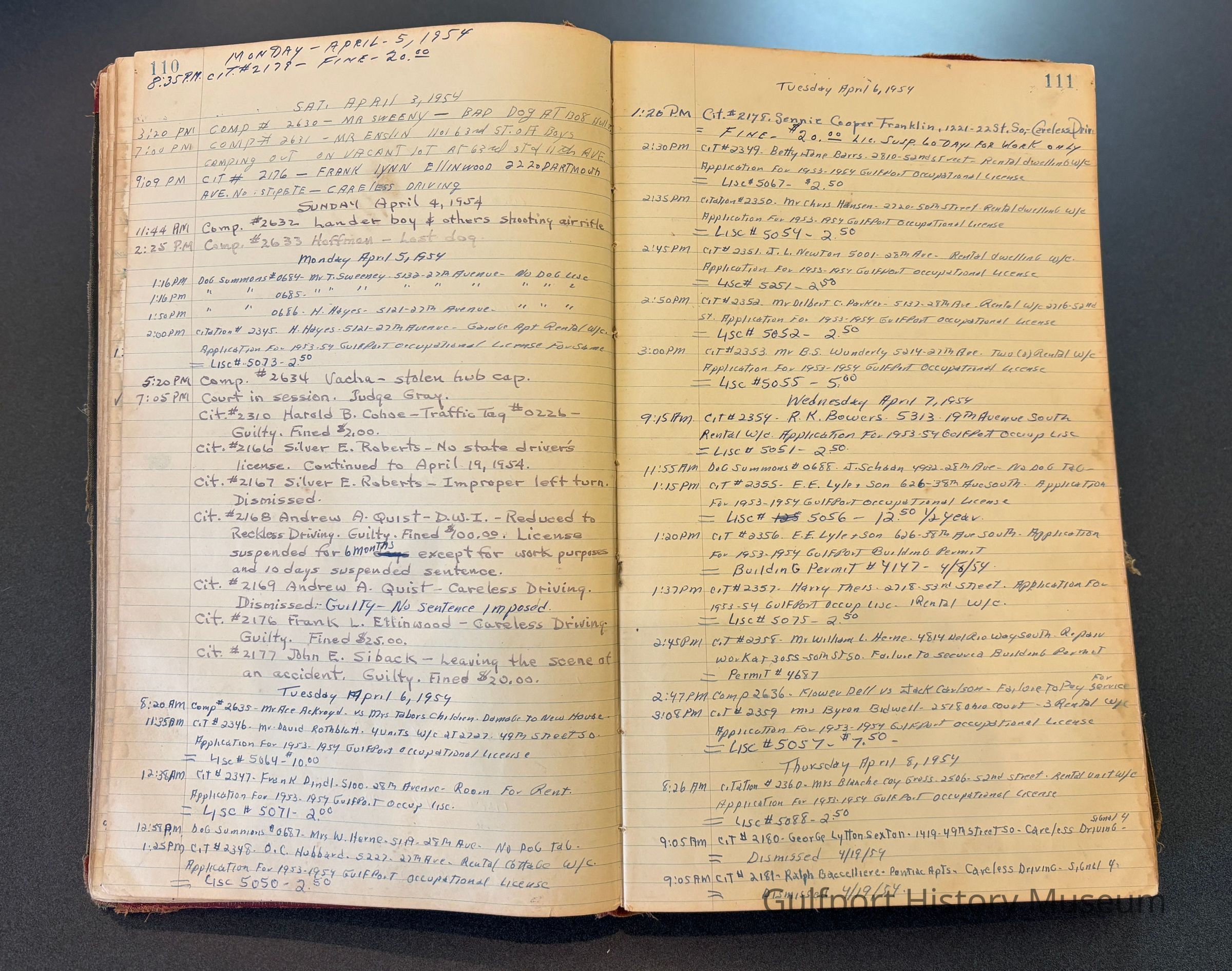 A log from the Gulfport Police Department for February 16, 1953 to February 10, 1957.Collection