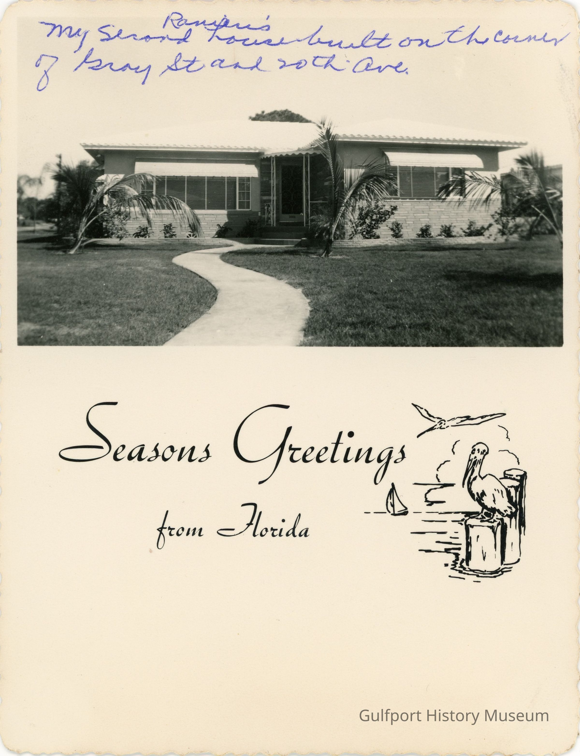 A holiday card with a black and white photograph of a house [built by Liberty Construction Company]. Below the image is text that reads, "Seasons Greetings from Florida" and a line drawing featuring a pelican and a boat.