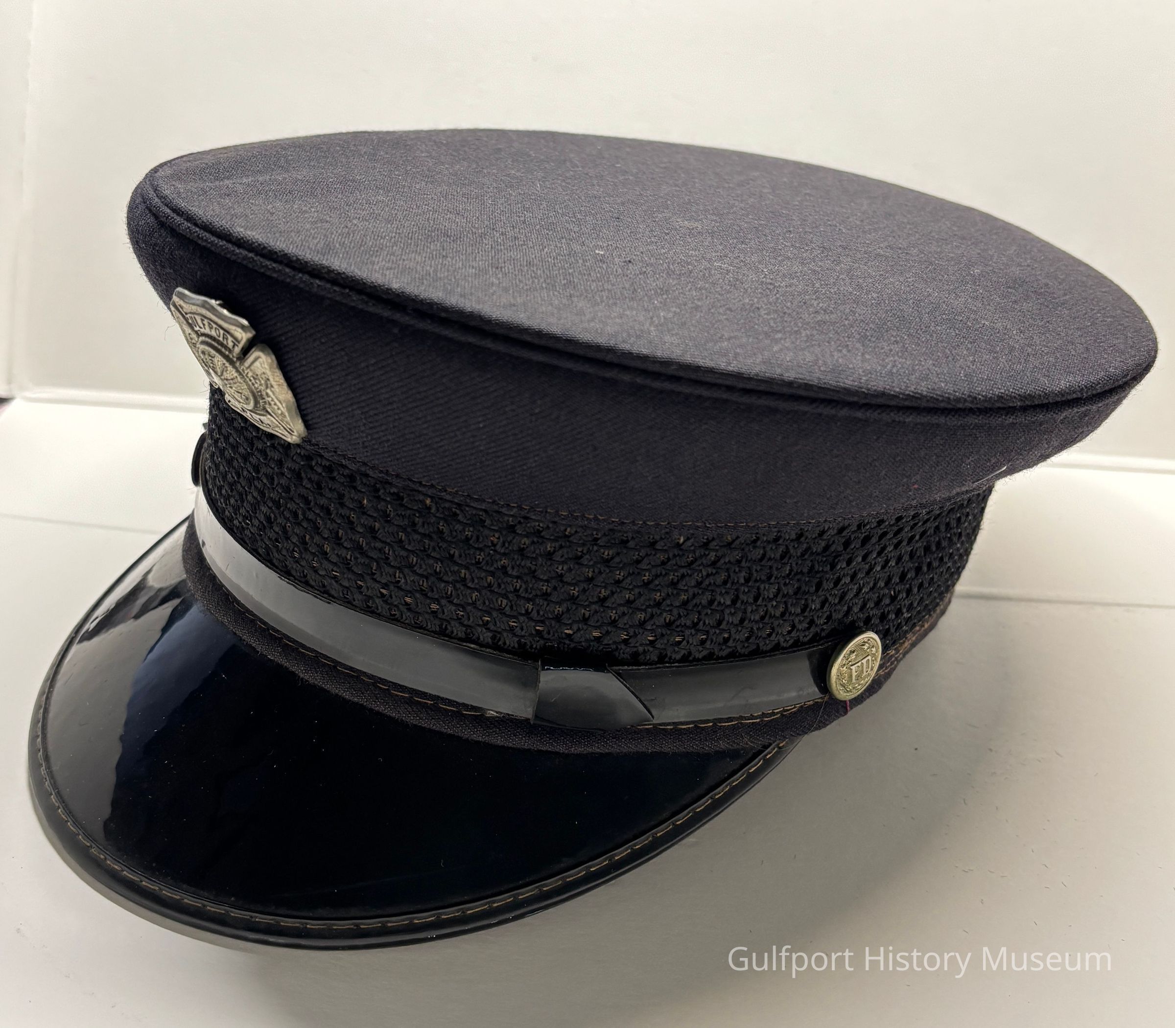 A navy bell cap with a black vinyl strap, silver FD buttons, and silver Gulfport pin.Collection
