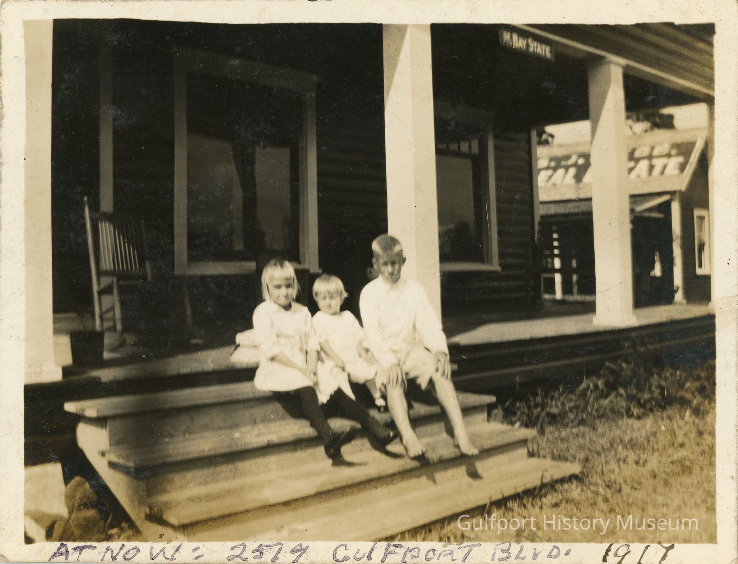 A black and white photograph of the Webb House at 2519 Beach Blvd S. Three children are sitting on the steps outside. A sign above them reads: "The Bay State." A real estate building is visible in the background next to the house. Handwriting in pen at the bottom of the photograph reads: "AT NOW: 2519 GULFPORT BLVD. 1917."