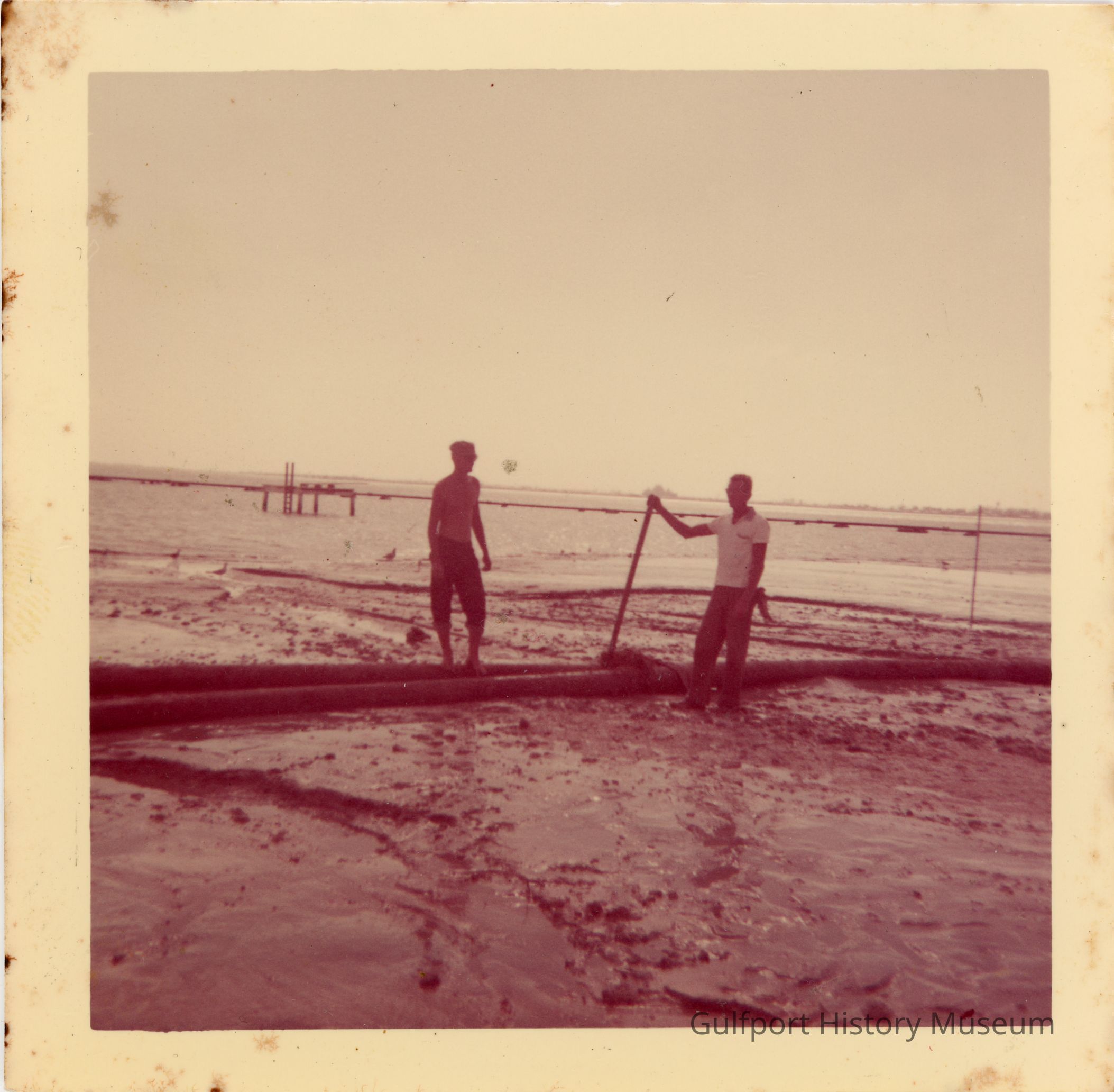 A color photograph of two men dredging at Gulfport Beach on Boca Ciega Bay. There is a large pipe stretching across the shore. The outline of The Don CeSar hotel can be seen in the far background.Photograph Details