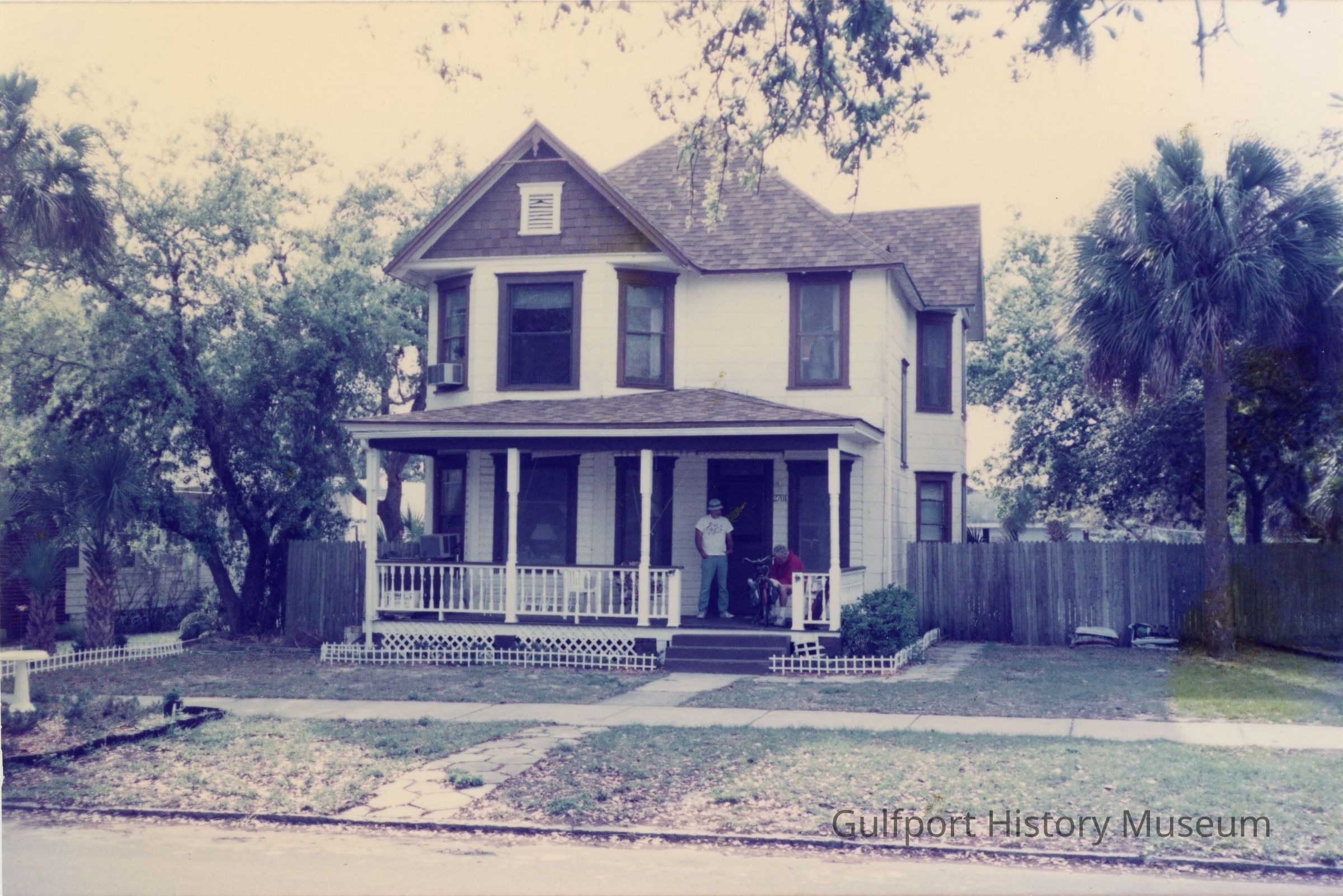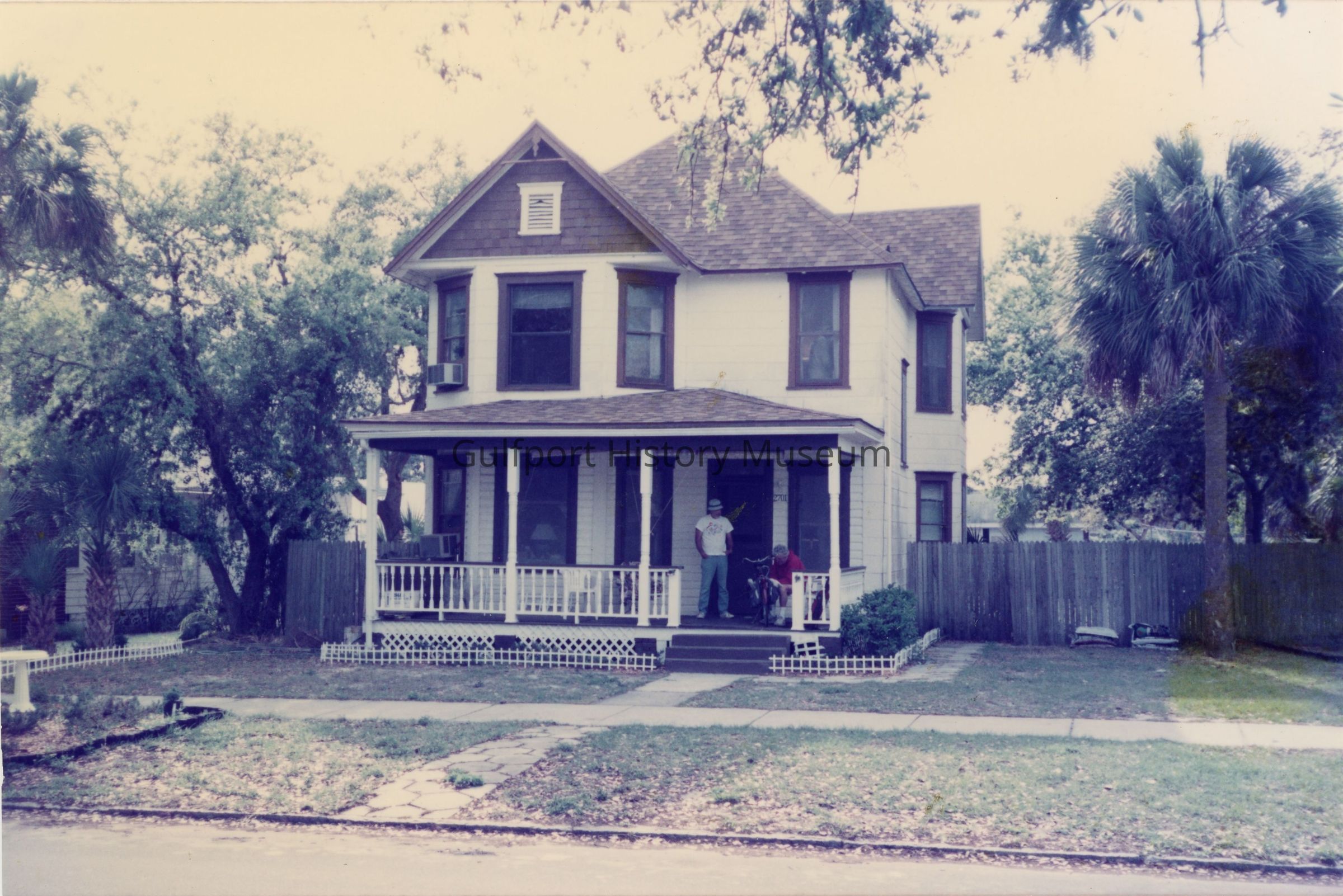 A color photograph of the Sackrider house at 2701 Beach Blvd S. Built circa 1910. Two men can be seen on the front porch, one sitting and one standing.Photograph Details