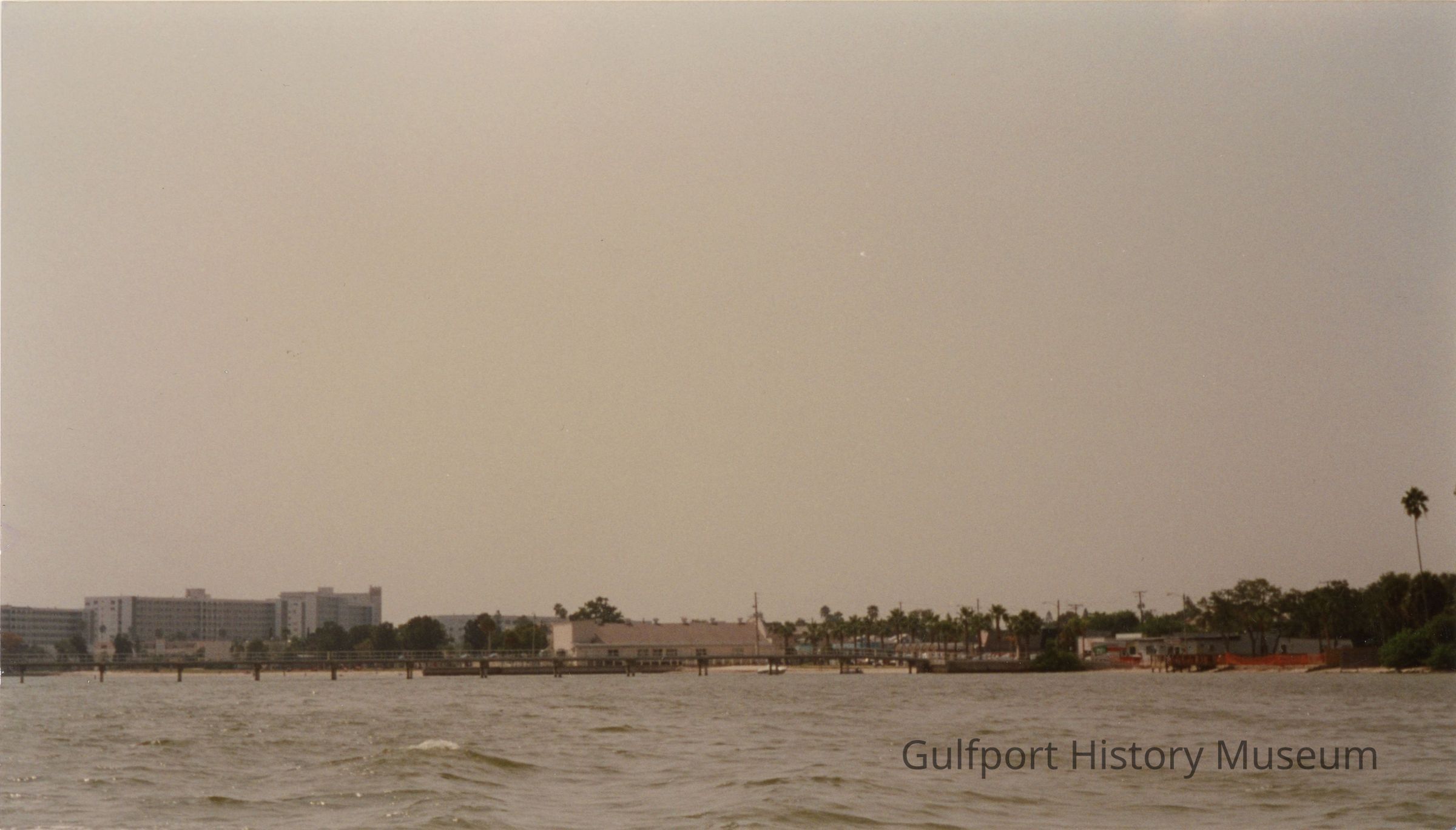 A color photograph of Gulfport Beach from Boca Ciega Bay. The Gulfport Casino, Gulfport Recreation Center, and Town Shores can be seen in the background. The sky is dark and grey and it appears to be windy.