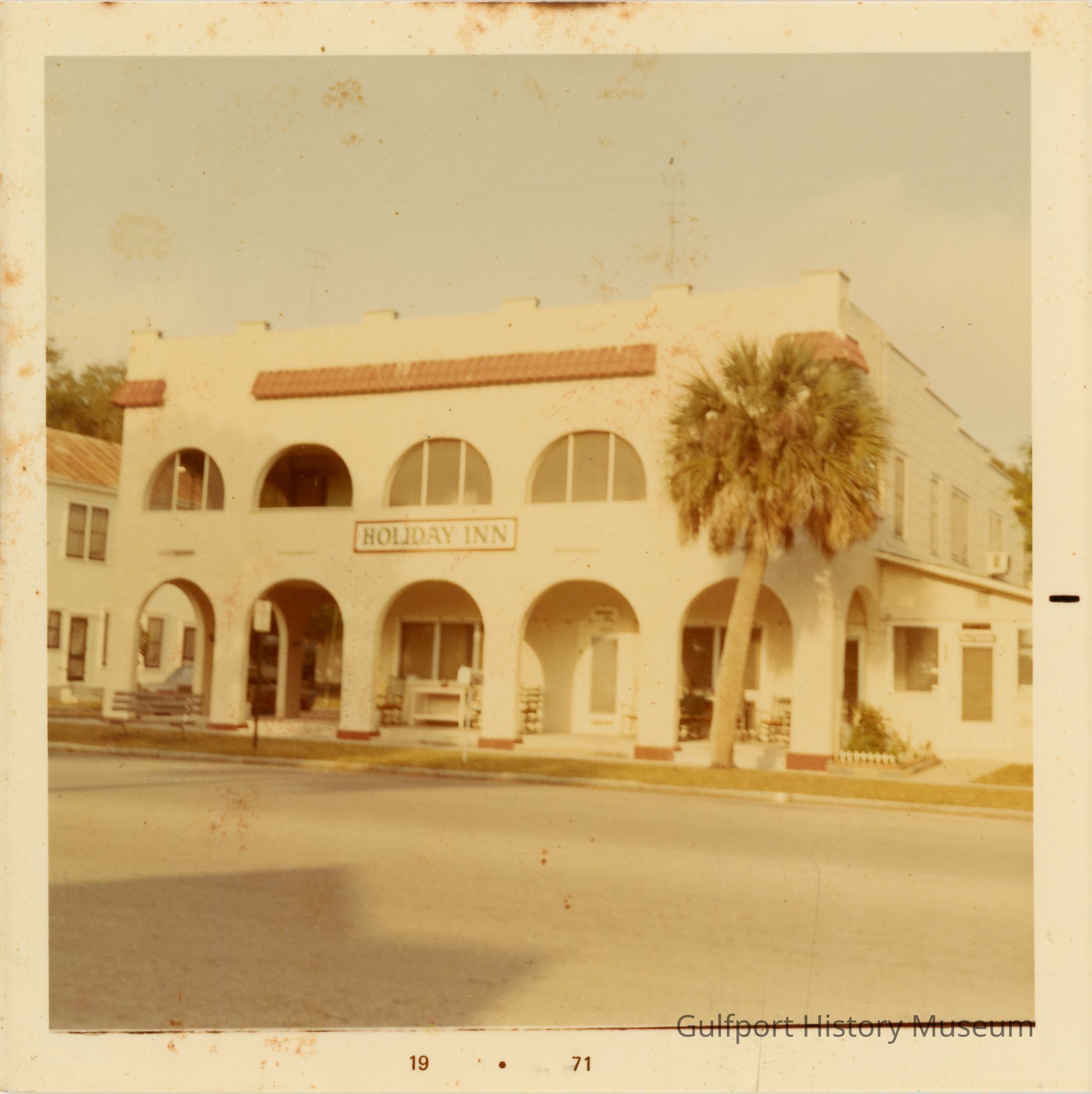 A color photograph of the Holiday Inn, a two story stucco-style apartment building on Beach Blvd S. The second floor windows are half moon shaped, mimicking the rounded arches on the ground floor. A palm tree grows in front of the building near the street.Photograph Details
