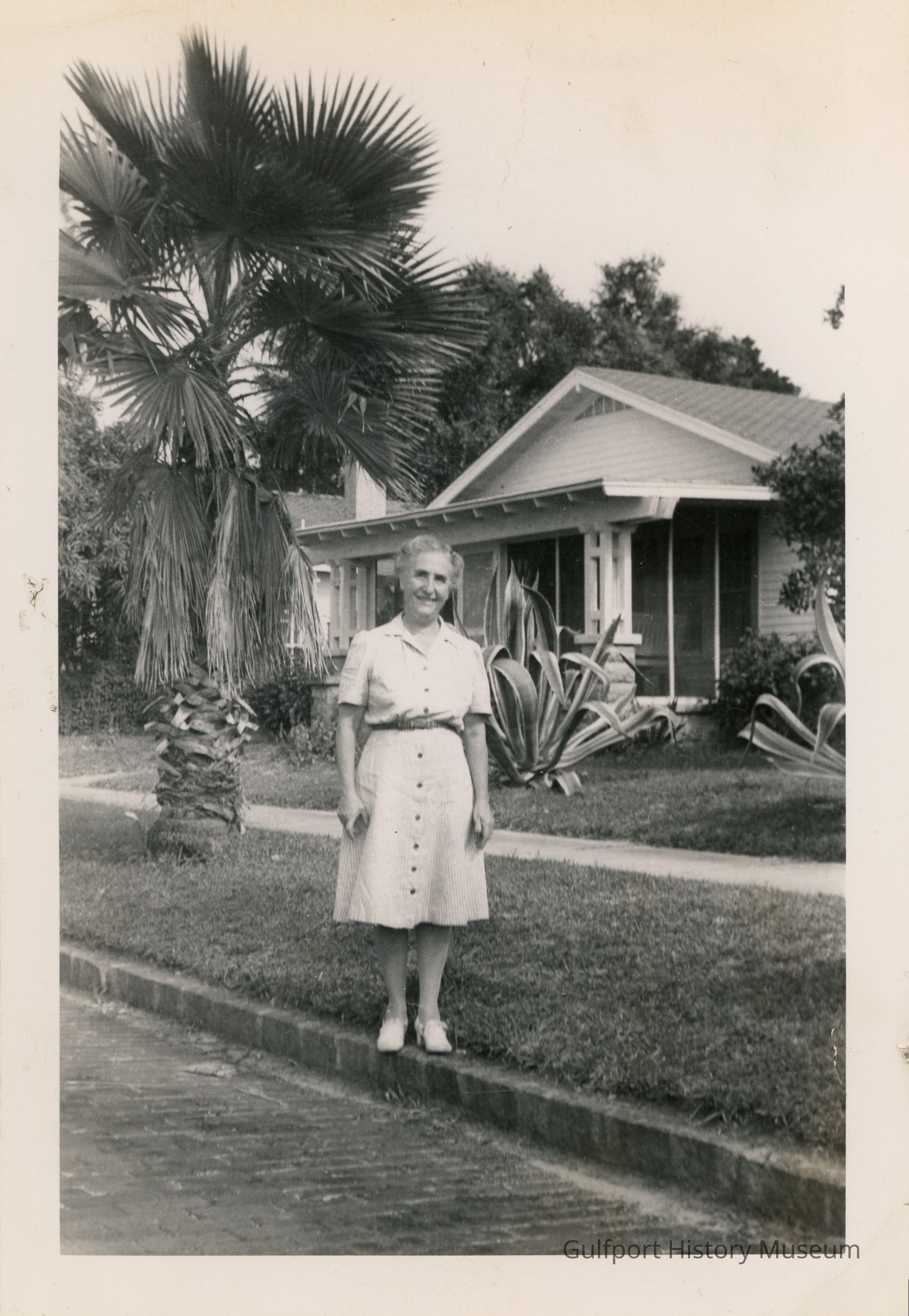 A black and white photograph of a woman standing outside of the house at 2816 56th St S.
