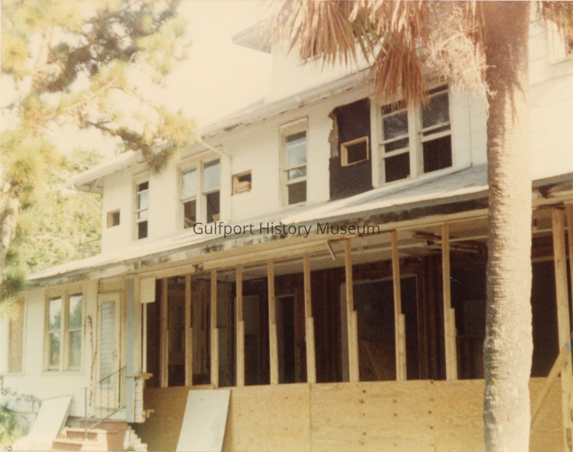 A color photograph of 2947 Beach Blvd during its renovation. The three story building has exposed wooden beams.